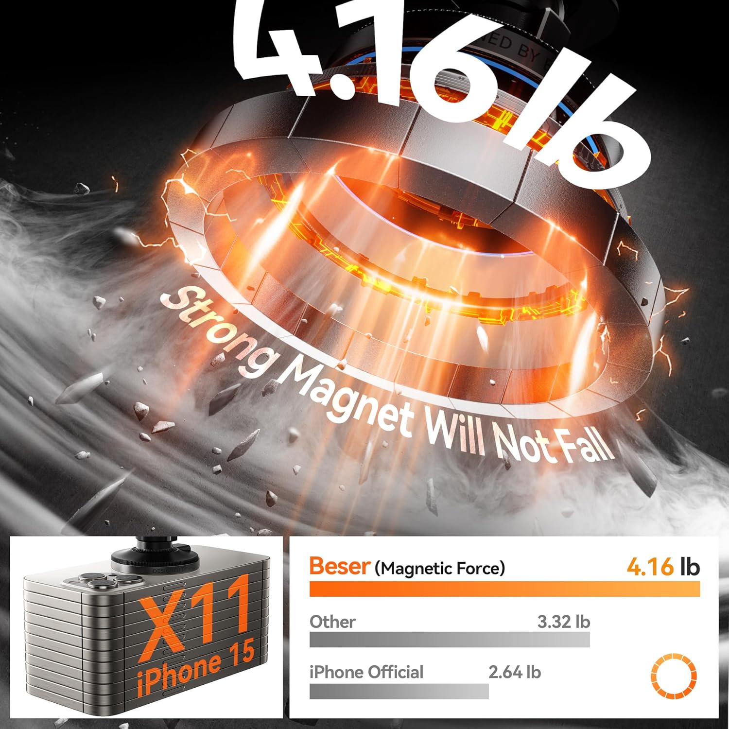 Our 15W MagSafe Car Mount Charger offers a sleek and compact solution for effortless in-car phone charging and mounting. Designed exclusively for iPhone 12 to 16 series, this mini aluminium charger combines strong magnetic power with fast Qi wireless charging performance. The 16 powerful N55 magnets ensure a firm 4.16 lbf hold, keeping your phone stable even on rough roads, while the BeserQI smart chip delivers 15W ultra-fast, safe charging. Its 0.35-inch slim profile and easy 18-second installation make it ideal for air vent or dashboard setups, fitting 99% of cars securely and scratch-free.