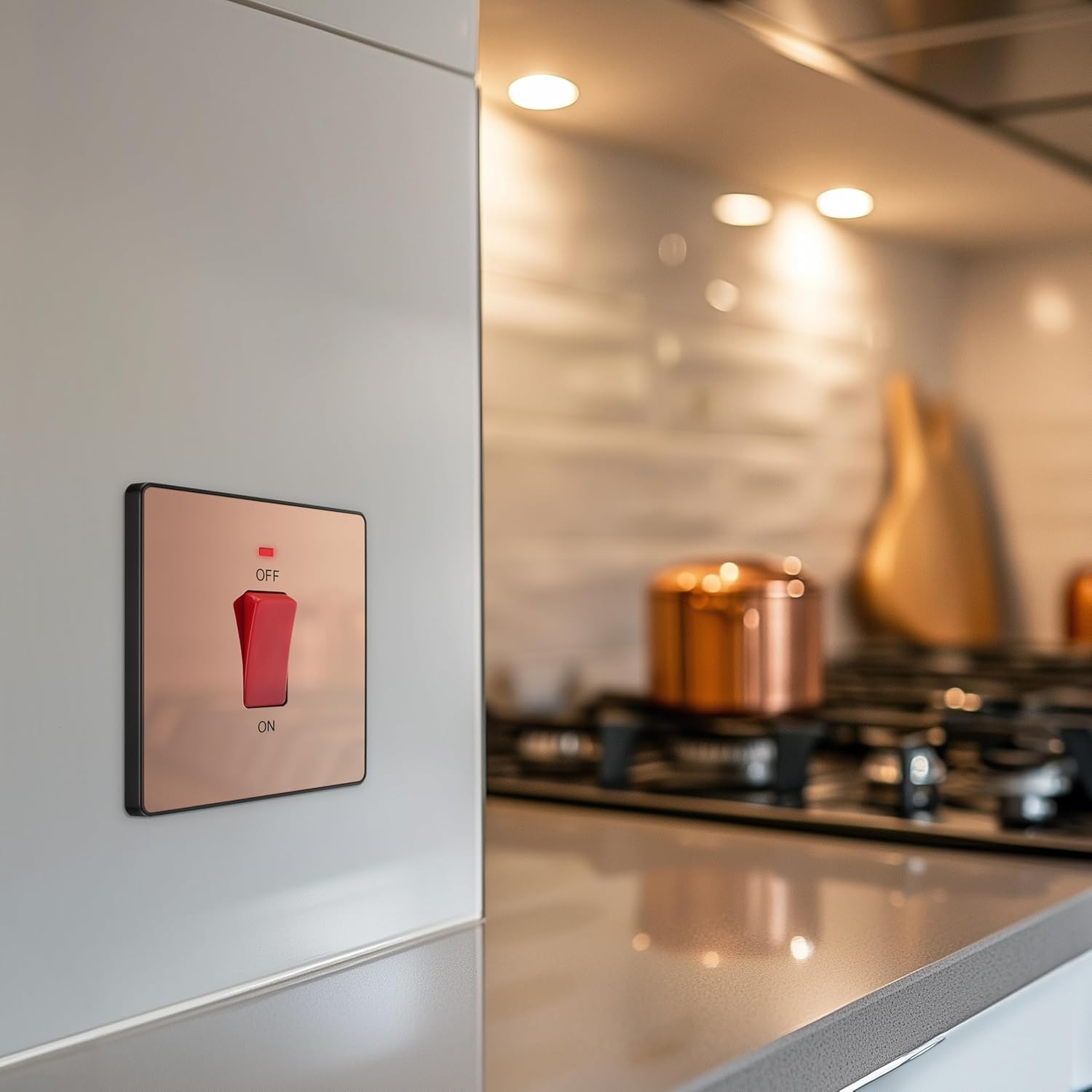 Our BG Electrical cooker control switch unit in polished copper provides a sleek, contemporary solution for safely controlling hardwired cookers, ovens, or hobs. Featuring a 45A double pole switch with LED power indicator, screwless removable front plate, and colour-coded captive screw terminals, it ensures easy installation and convenient operation. Ideal for modern interiors and retrofit applications, this switch is part of the BG Evolve range and delivers both safety and style with a 25-year manufacturer’s warranty.