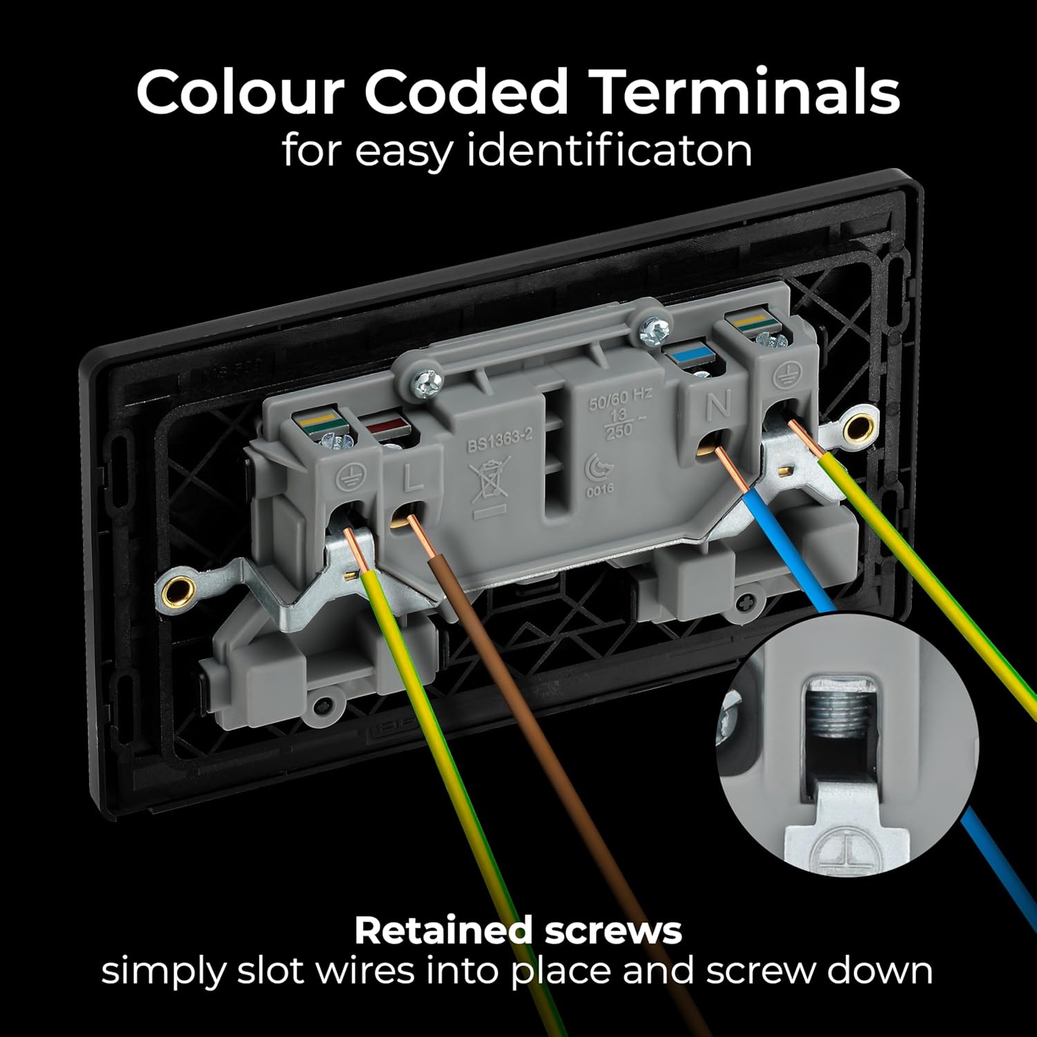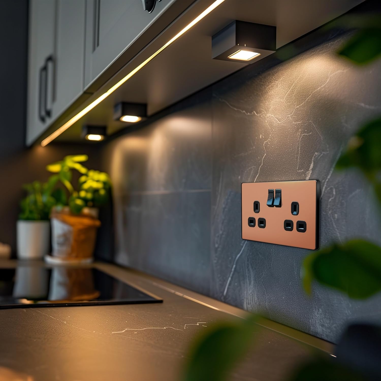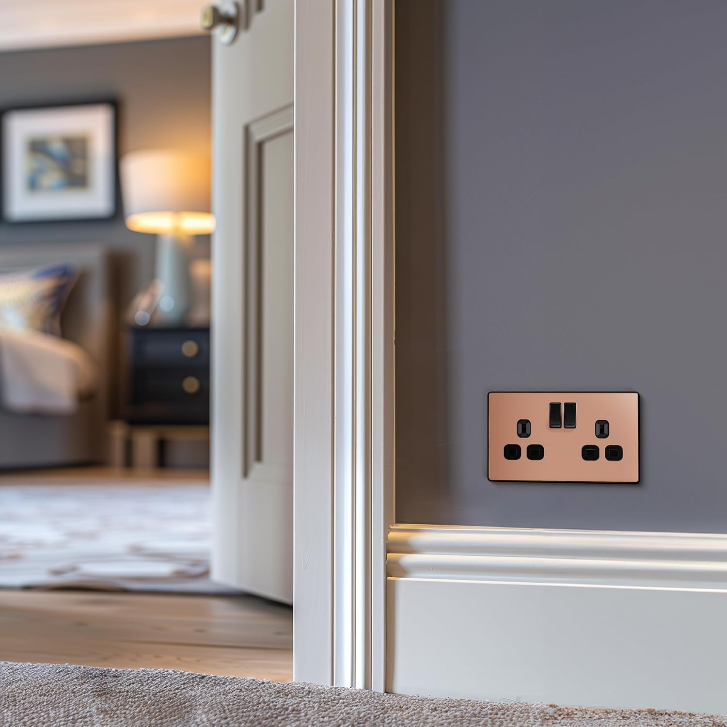 Our BG Electrical double switched power socket in polished copper offers a slim and contemporary design ideal for modern interiors. Featuring a screwless removable flat plate for easy redecoration, angled in-line colour coded terminals with captive screws for straightforward wiring, and certified to BS1363-2 and BS 7671:2008, this 13A socket ensures safe, reliable performance for everyday electrical use.