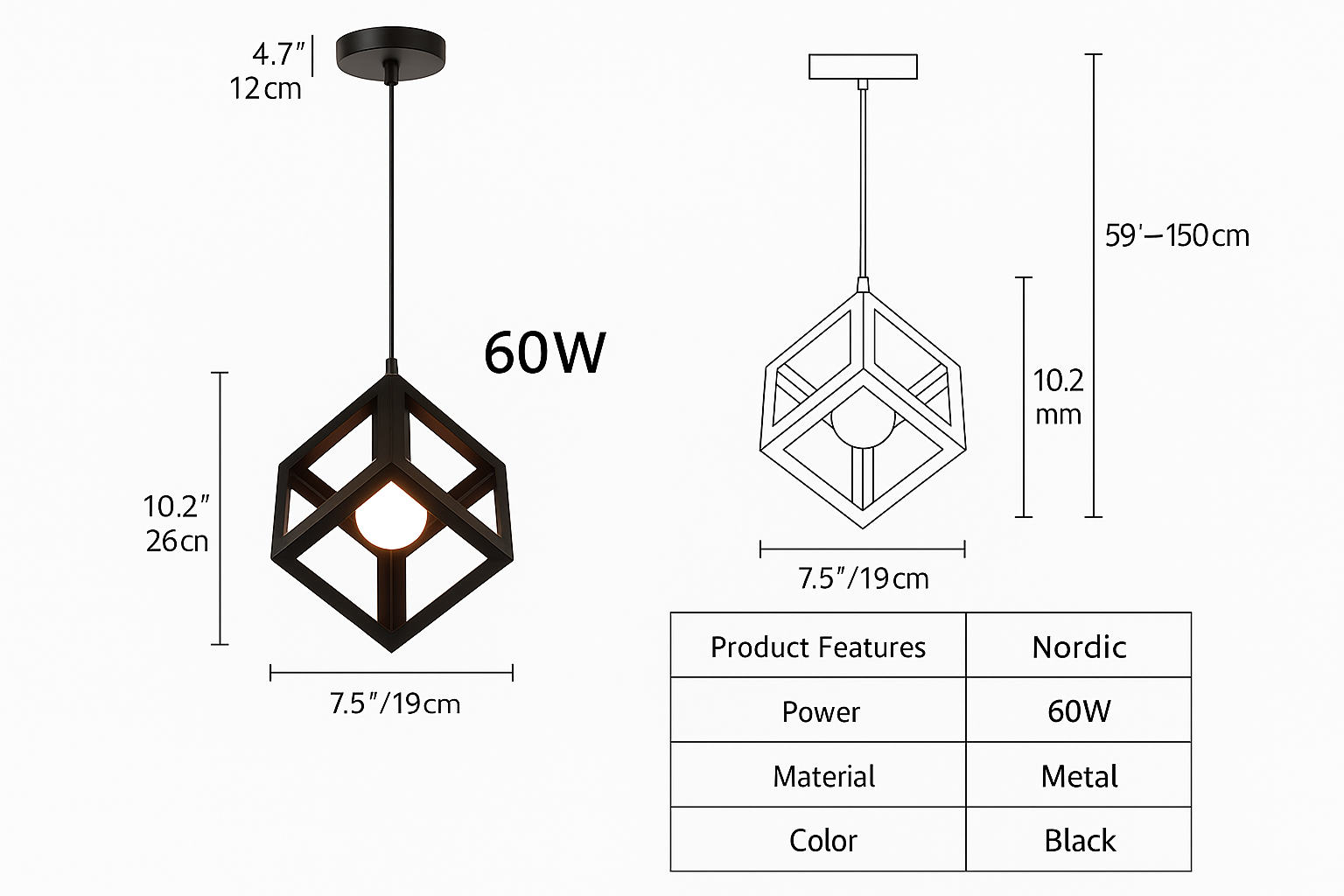 Black 60W Nordic Cube Pendant Lamp – Modern Industrial Lighting