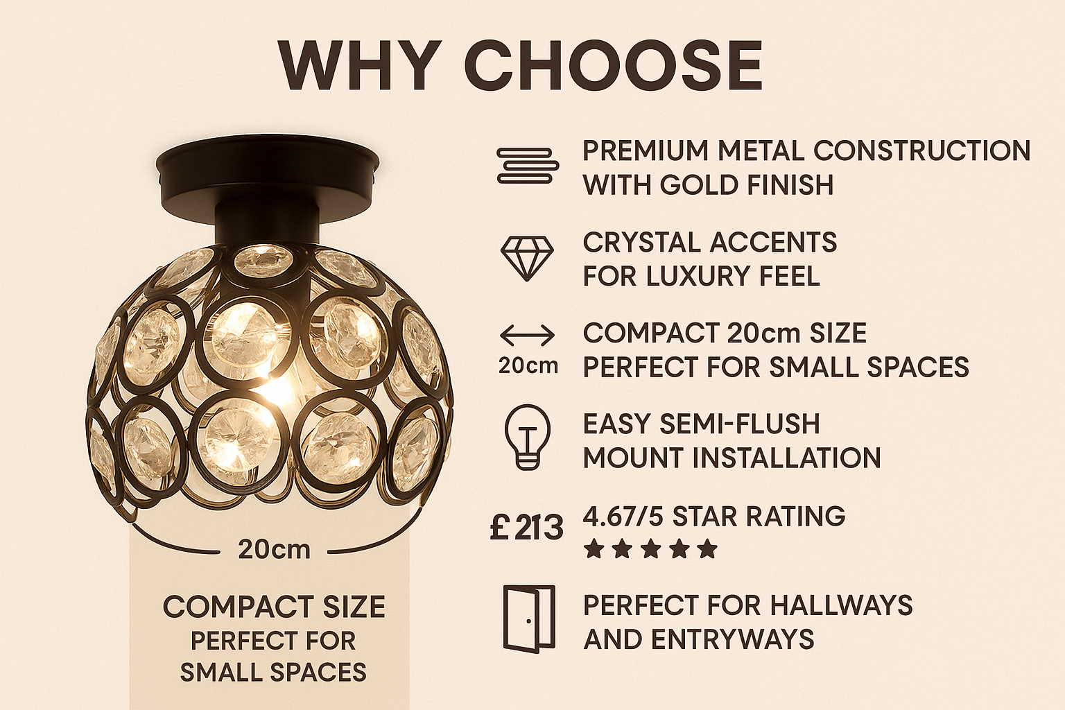This elegant Black ceiling lamp is perfect for both vintage and contemporary interiors, offering stylish illumination in compact spaces. Its durable metal build and sophisticated gold finish make it a standout feature in UK homes, whether in an entryway, hallway, or porch.