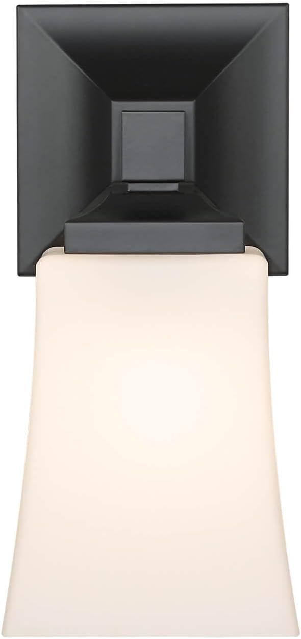 - Matte black squared backplate with white glass lampshade