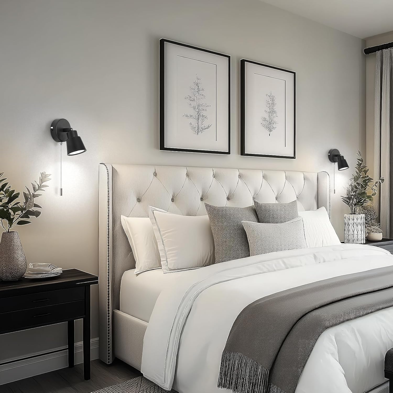 Our black pull cord wall light combines functionality and modern design, providing versatile illumination for bedrooms, living rooms, kitchens, and more. Featuring a 22cm long pull cord switch for easy on/off operation, a compressible spring lamp head for quick GU10 bulb installation, and a 350° rotatable head with 90° up-and-down adjustment, this wall sconce allows precise lighting direction. Its sleek metal construction with a frosted black finish ensures durability and style, making it ideal for bedside, reading, or decorative lighting applications.