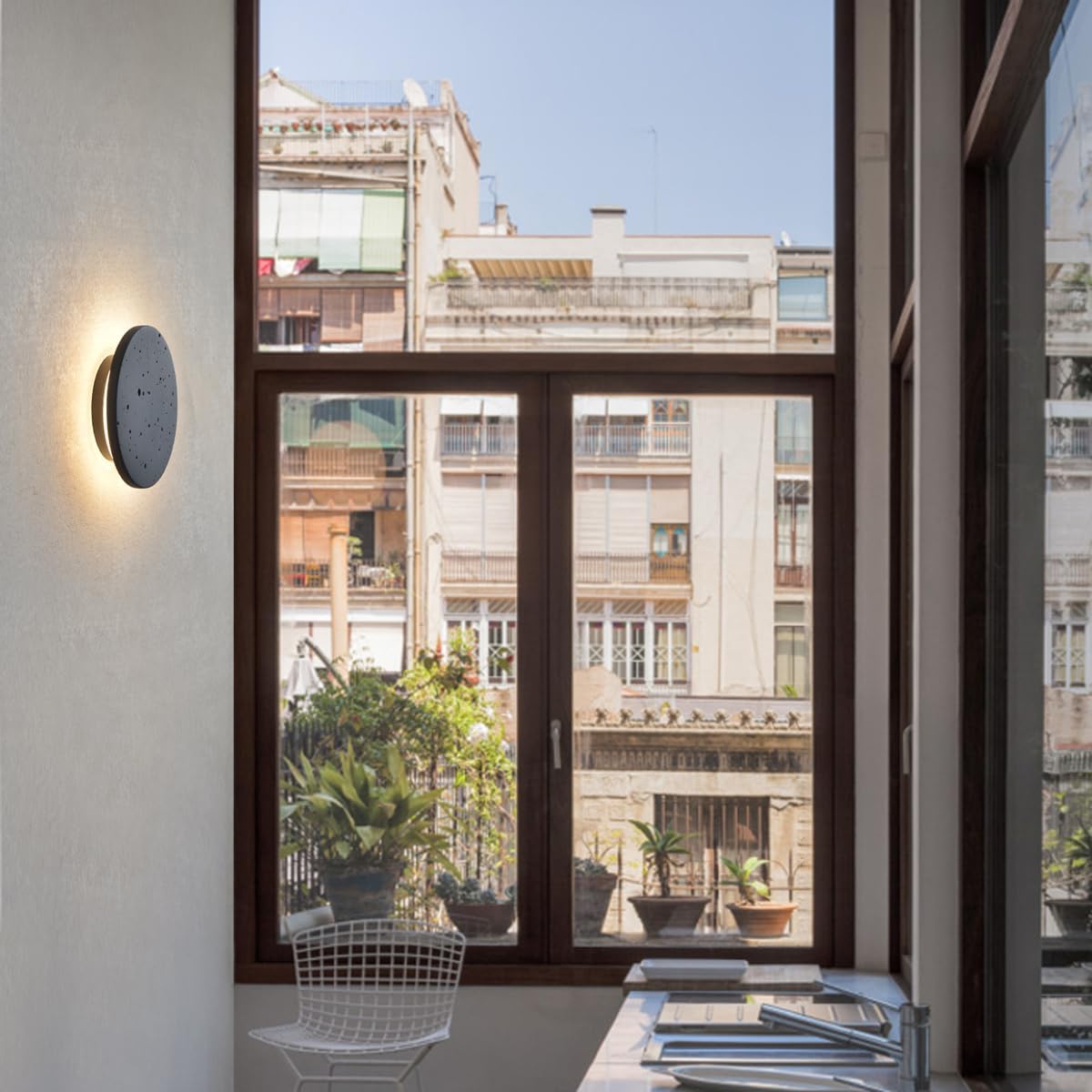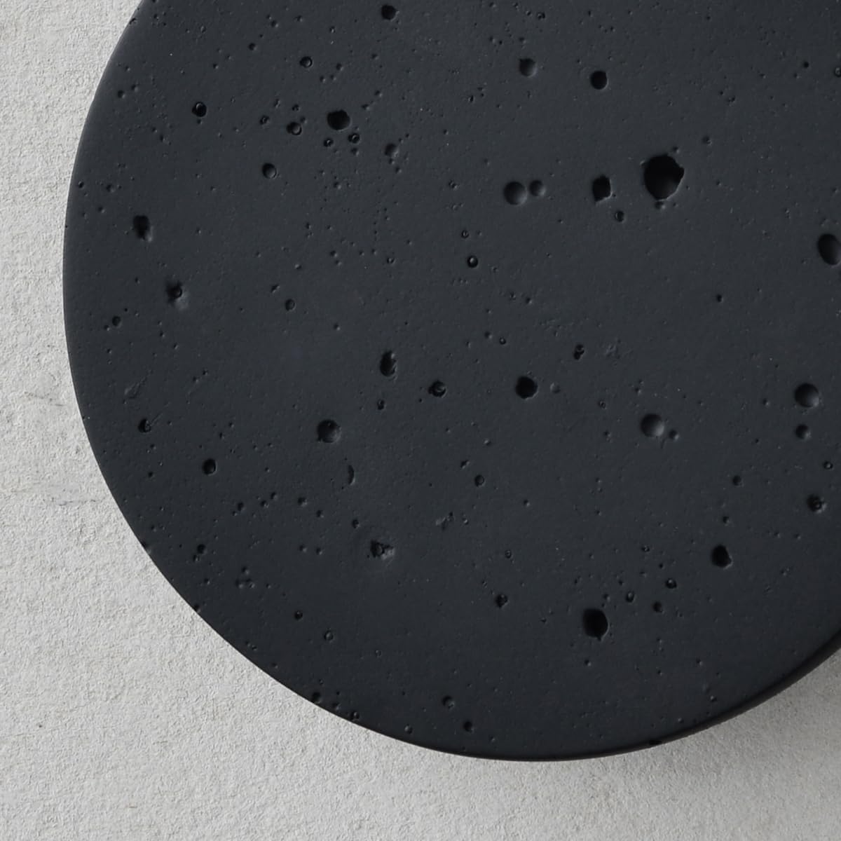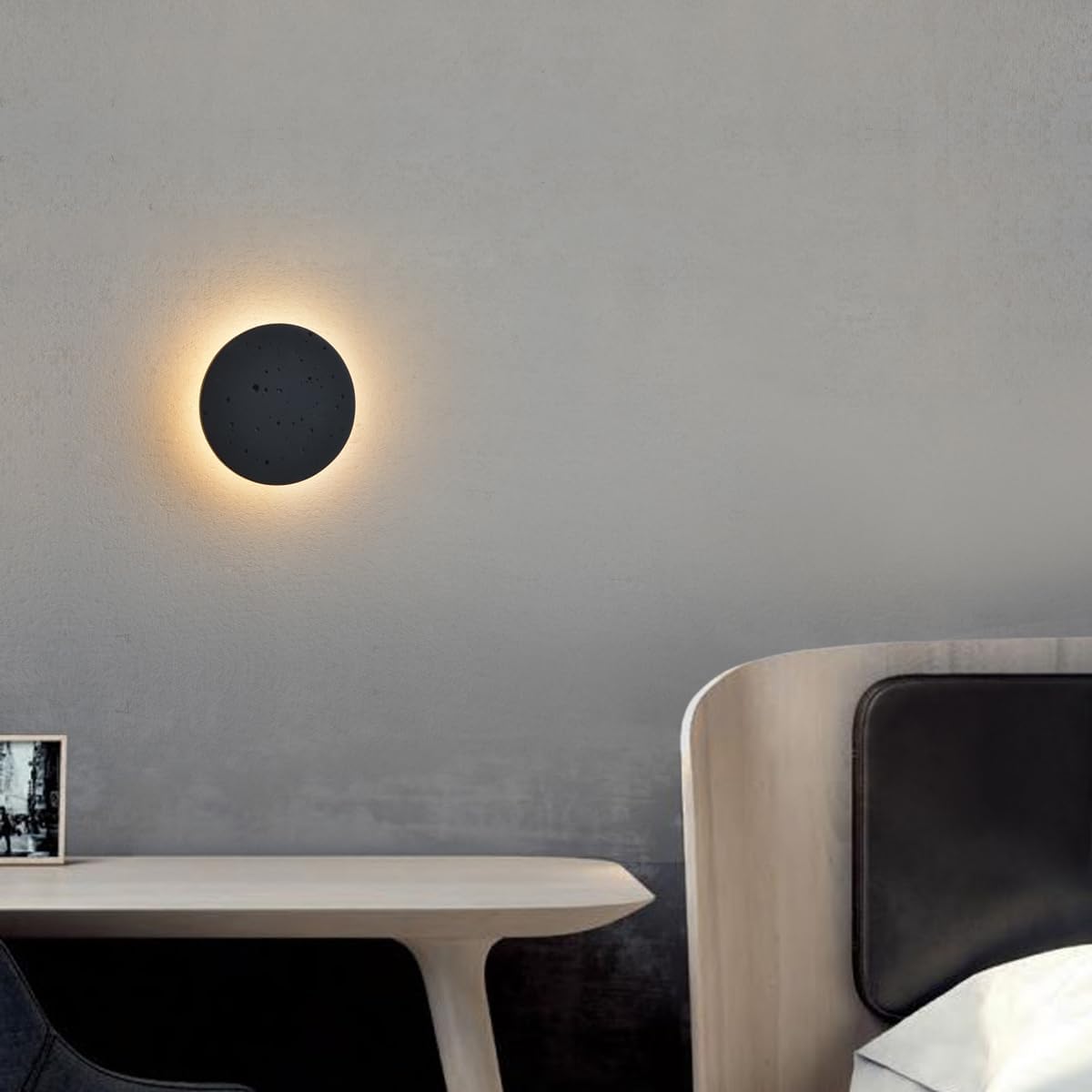 Our black round LED wall sconce is designed to provide soft, ambient indoor lighting while enhancing modern interiors with an artistic minimalist appeal. Crafted from cement with a lunar-inspired textured surface, this wall-mounted light delivers indirect, glare-free illumination in a warm white tone, creating a calm and inviting atmosphere. Its flat, round design blends decorative wall art with practical lighting performance, making it suitable for a variety of residential interior spaces where subtle elegance and functional lighting are required.