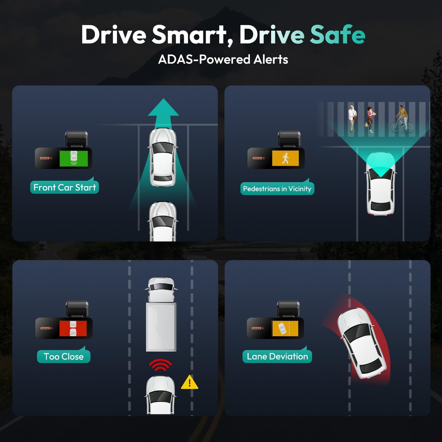 Designed with built-in GPS and 2.4G/5G WiFi, this dash cam allows real-time video sharing, speed tracking, and route playback directly through the BOTSLAB App. The ADAS (Advanced Driver Assistance System) feature offers intelligent alerts such as lane deviation, forward vehicle movement, and fatigue reminders for safer journeys. Additionally, the 24/7 parking mode and G-sensor emergency recording ensure continuous protection, even when your vehicle is unattended.