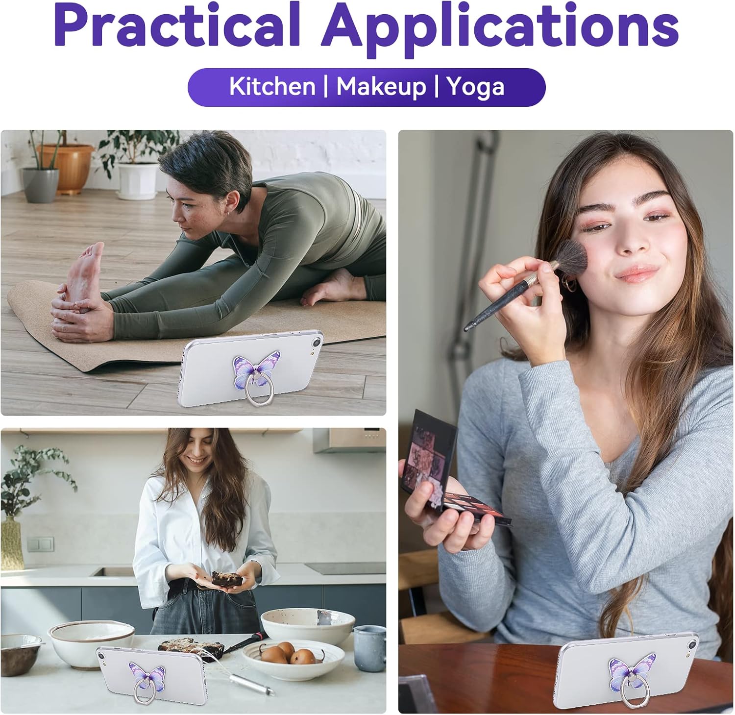 Our butterfly phone ring stand holder set provides a stylish and secure way to grip your smartphone, featuring three beautifully painted butterfly designs made with strong acrylic material. Each holder offers a reliable adhesive backing to prevent accidental drops while allowing 360° rotation and a 180° flip for adjustable, comfortable viewing angles when reading, watching videos, or video calling. Designed for universal compatibility, this set enhances convenience, protection, and hands-free use without compromising the original look of your device.