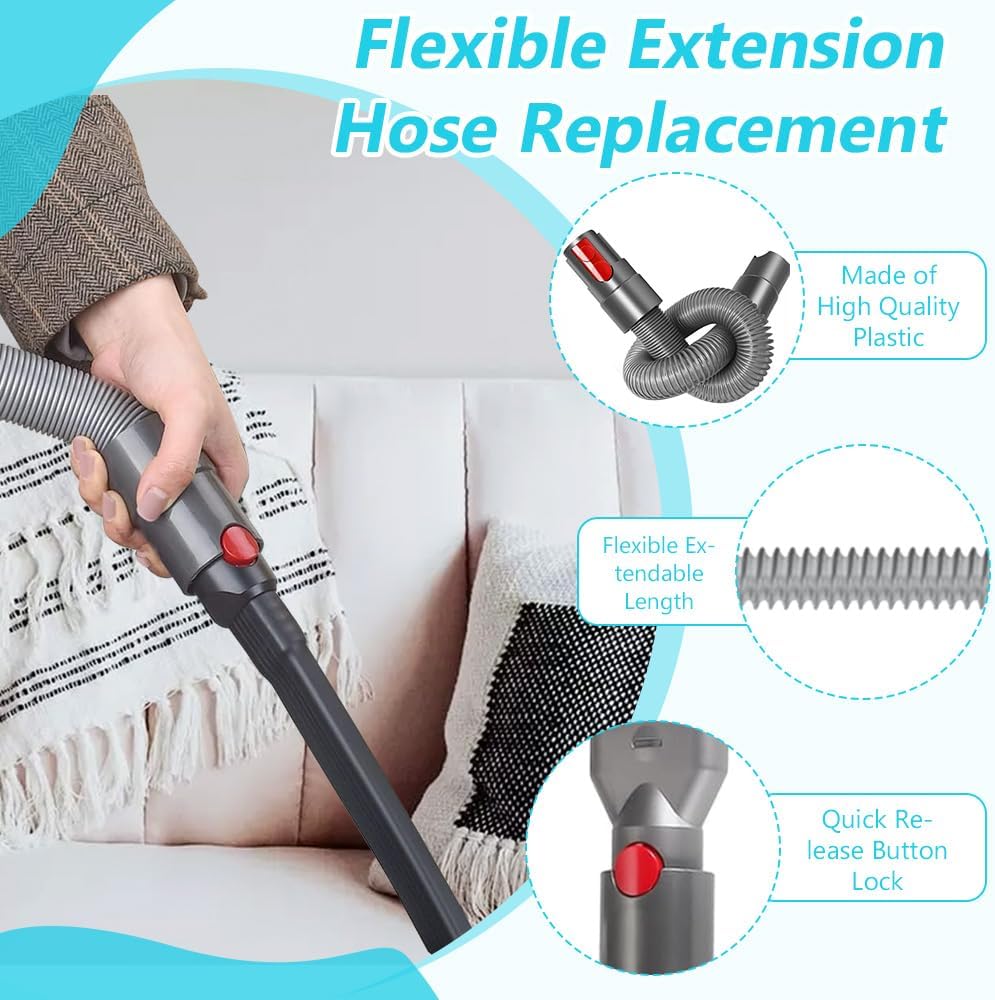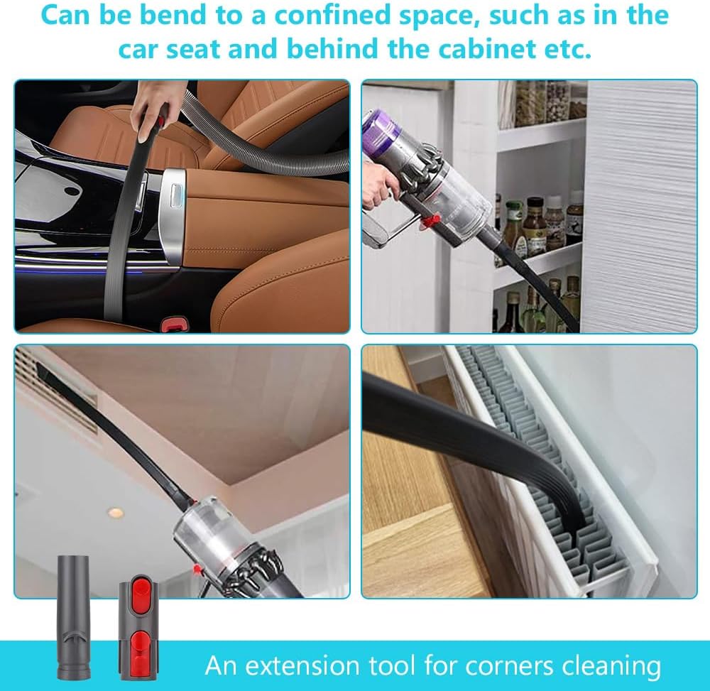 Our BUZIFU Cleaners Hose with Flexible Extension is a **durable replacement accessory compatible with Dyson V7, V8, V10, V11, V12, and V15 vacuum cleaners**. Made from **high-quality ABS plastic**, it offers excellent wear resistance, sealing, and long-lasting performance. The **extendable hose** reaches up to 150cm and features a bendable connecting nozzle, allowing easy access to furniture undersides, ceiling corners, and car interiors. The **flexible crevice tool** with a flat nozzle ensures effective cleaning of tight spaces and hard-to-reach areas without damaging surfaces. Designed for **quick and secure attachment**, this set improves your vacuum’s reach and efficiency for precise, hassle-free cleaning.
