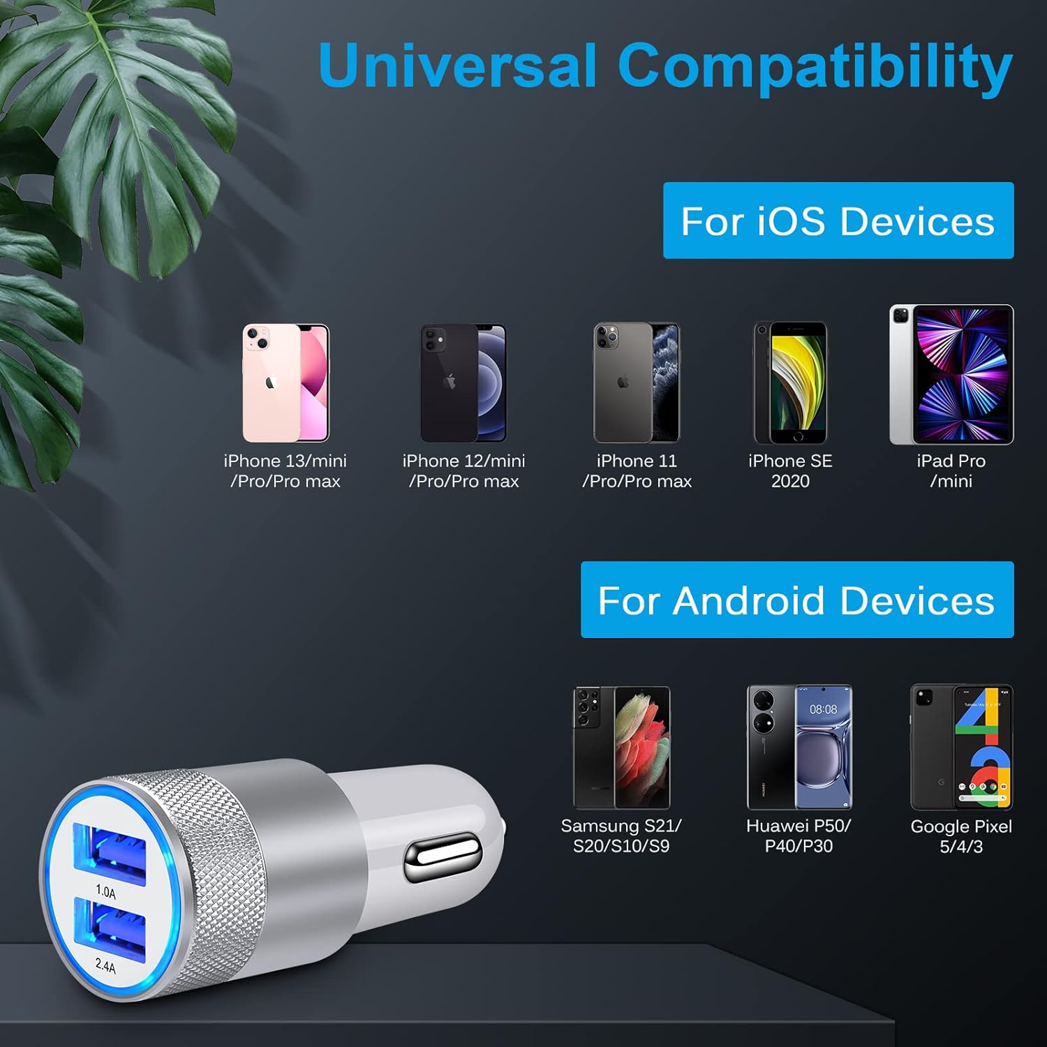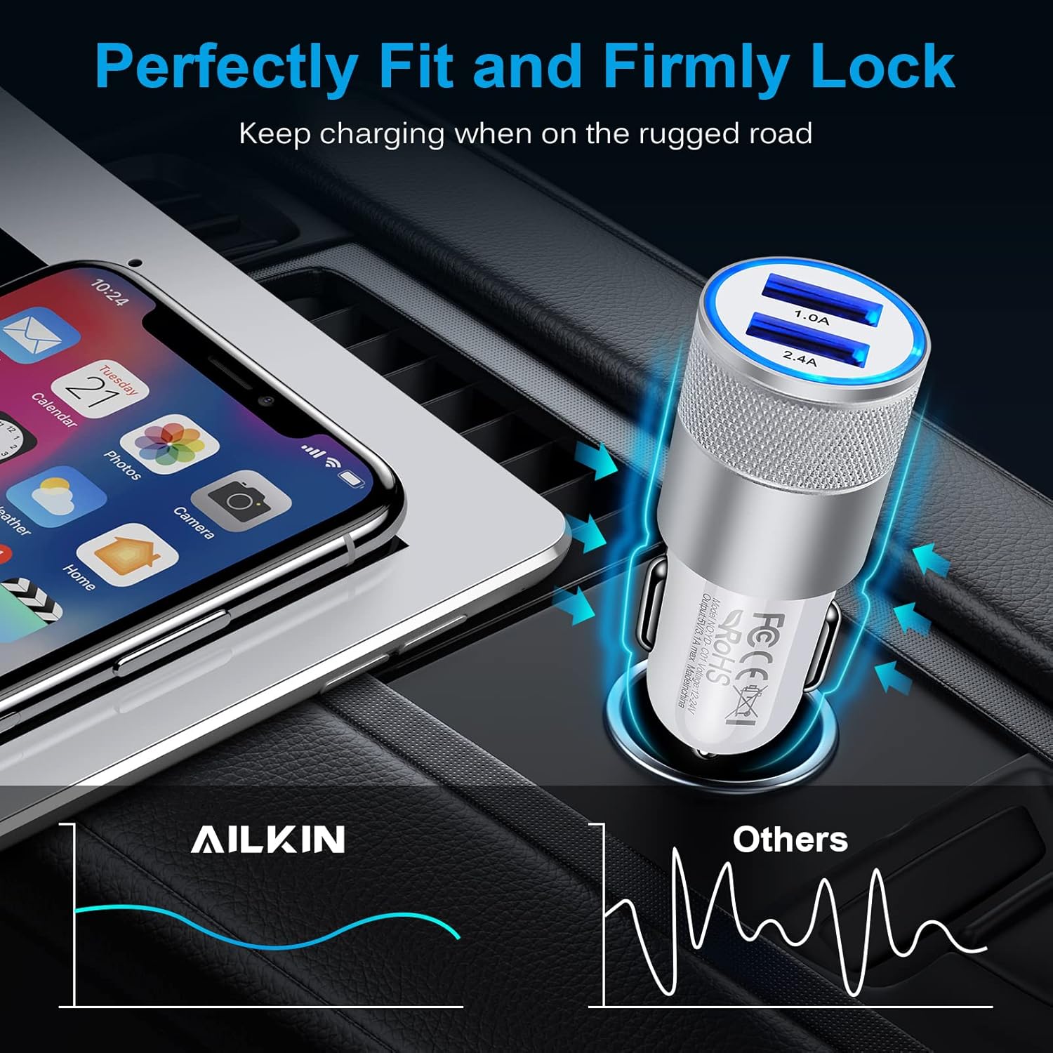 Our AILKIN 3.4A dual port car charger adapter delivers efficient and reliable charging for your devices, with a total output of 3.4A (5V/2.4A + 5V/1A). Designed to charge two devices simultaneously, it intelligently recognises connected devices to provide optimal and safe charging speed. Built with fire-proof materials and an intelligent circuit, it protects against short circuits, overheating, over-current, and overcharging, ensuring safety on every journey. The compact aluminium alloy and hard plastic design includes a soft LED indicator for easy visibility in the dark, making it convenient to use and carry anywhere. Compatible with a wide range of smartphones and tablets, including iPhone 15/14/13/12/11 series, Samsung Galaxy S and A series, iPads, and Google Pixel devices, this charger is a versatile solution for on-the-go charging.