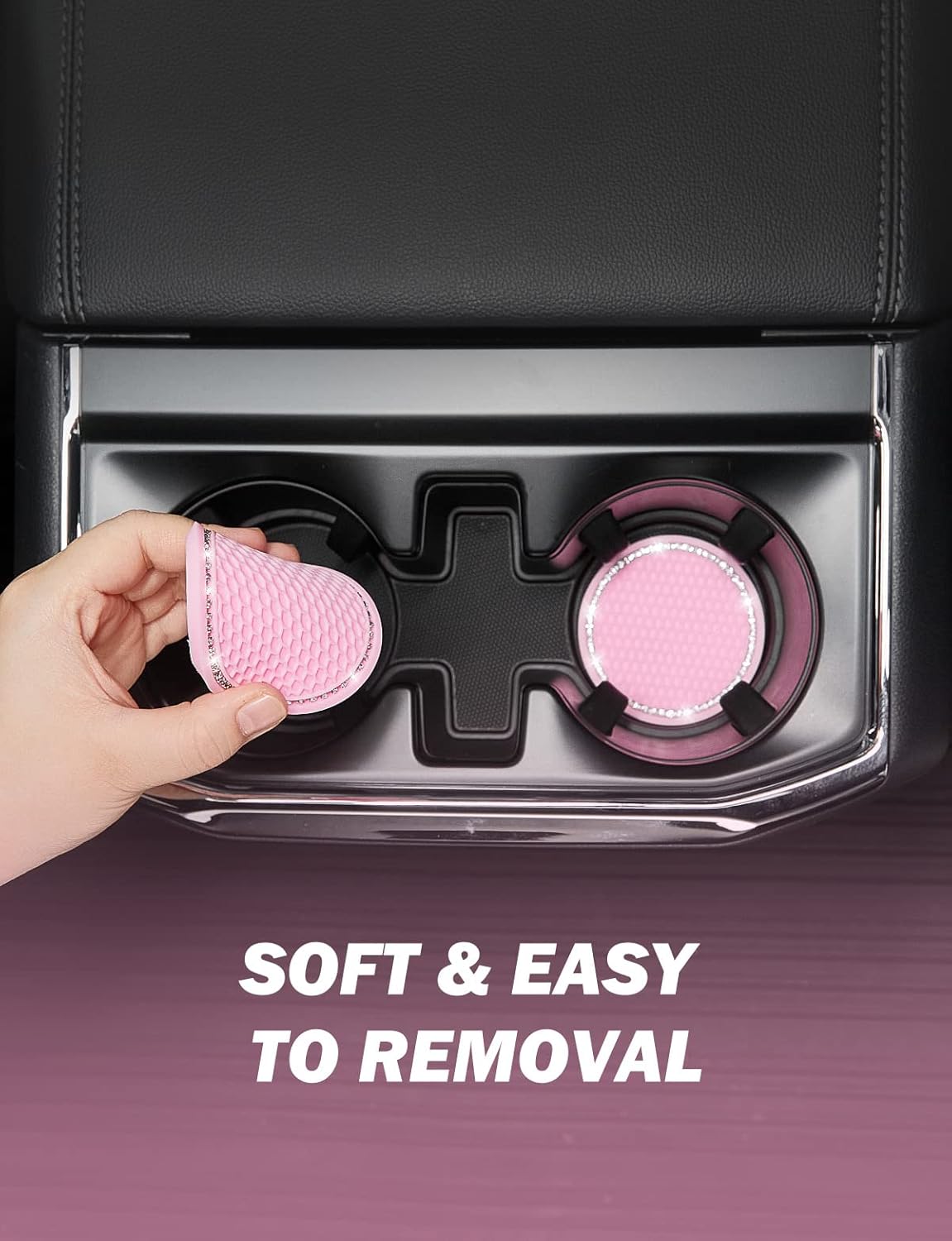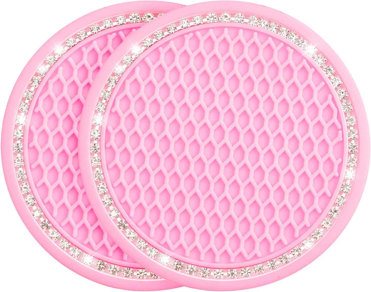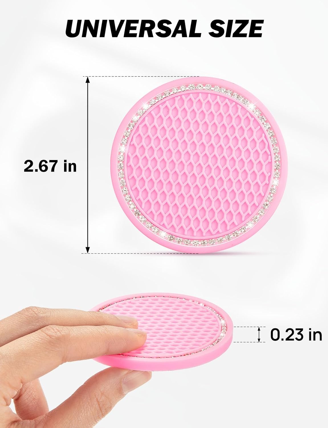 Our 2.67 inch Car Cup Holder Coasters with crystal rhinestones add elegance and practicality to any vehicle interior. Crafted from premium non-slip silicone, these durable inserts prevent cup movement and protect holders from scratches and spills. The sparkling rhinestone design offers a touch of luxury, while the easy-to-clean silicone ensures lasting use. Perfect for cars, home, or office use, these coasters combine functionality and style for everyday convenience.