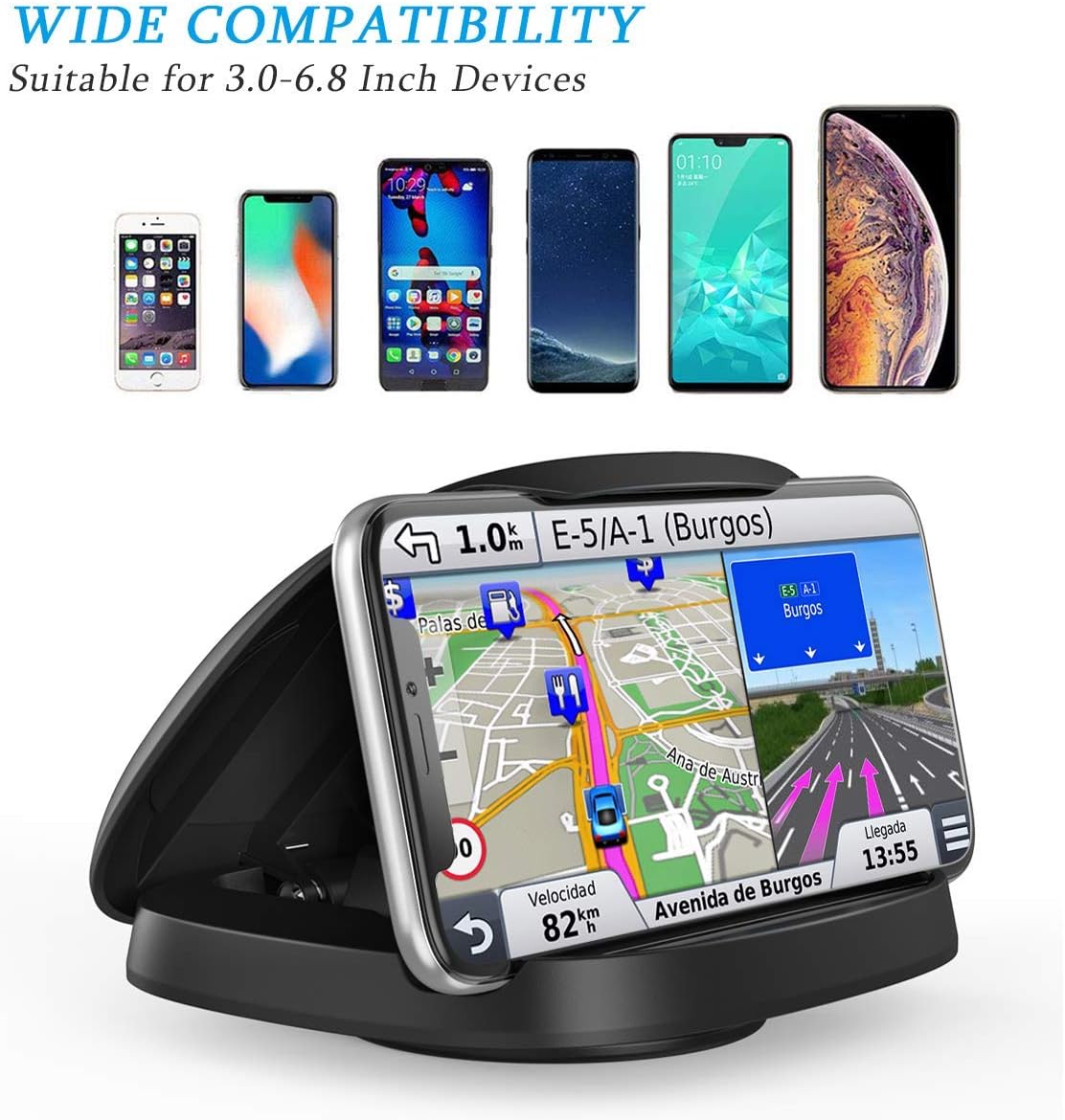 Our car dashboard phone holder offers a stable and secure way to keep your smartphone in view while driving. Built with a high-tech reusable adhesive base, this mount ensures strong grip without damaging your dashboard surface. Its 360° rotating base allows for both horizontal and vertical placement, letting you adjust your phone for optimal viewing. Designed to resist sunlight glare and reflections, the anti-slip silicone-textured bottom protects your phone from scratches and keeps it steady during sharp turns or sudden stops. Compatible with a wide range of devices, this environmentally friendly ABS phone holder provides lasting durability and convenience on every journey.