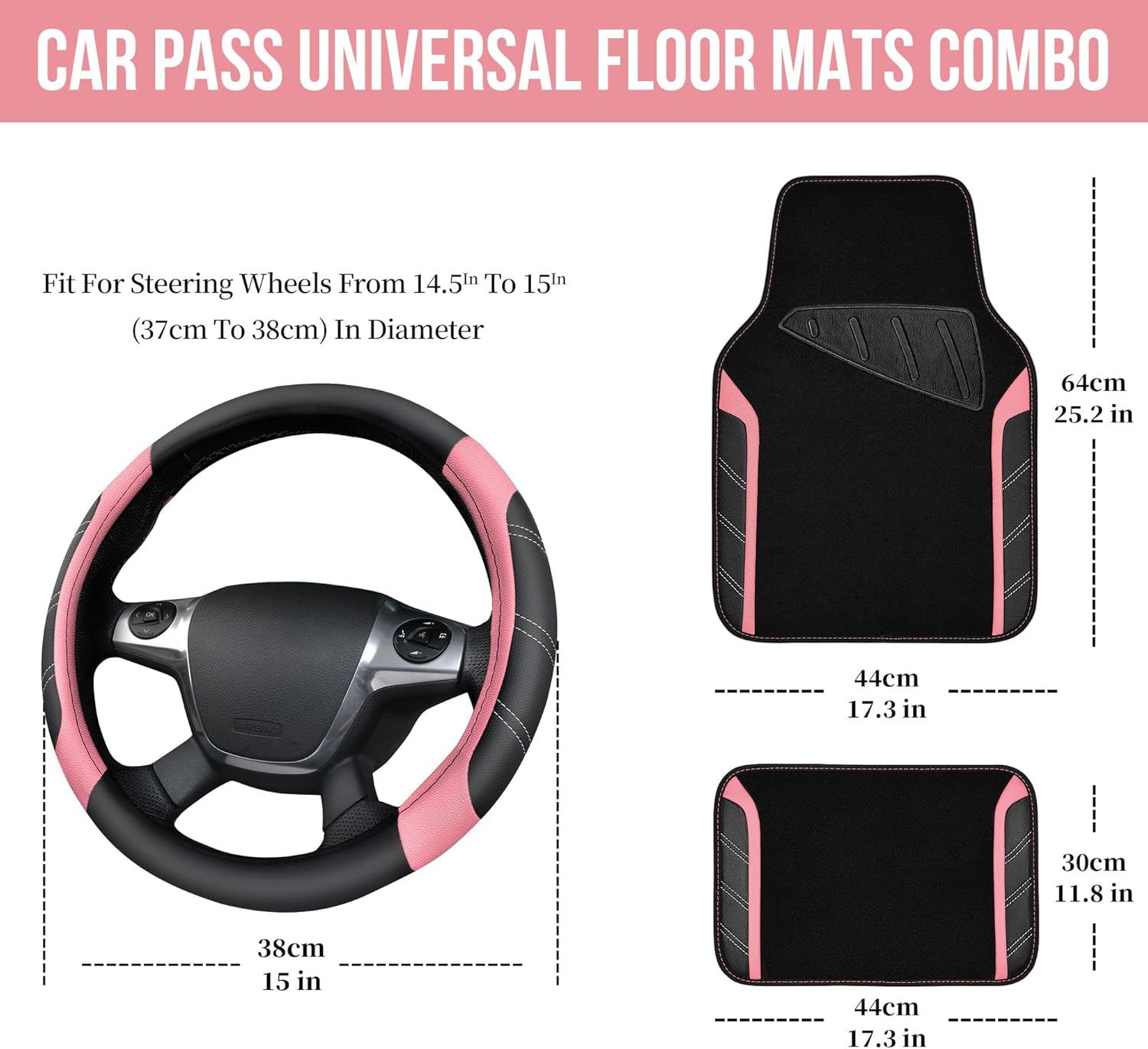 Our CAR PASS Microfiber Steering Wheel Cover and Waterproof Car Floor Mats combo offers premium protection and comfort for your vehicle. The high-quality microfiber leather steering wheel cover guards against sun damage, scratches, cold, moisture, and dirt, while the odorless TPR inner grip ensures a safe, non-slip hold. The included waterproof car floor mats feature a heavy nibbed backing to stay securely in place, protecting your car’s interior while maintaining safety. Designed for universal fit, the steering wheel cover accommodates 14.5–15 inch wheels, and the mats are engineered to fit most cars, trucks, vans, and SUVs. Easy to install with a simple warming step, this combo provides long-lasting durability and enhances driving comfort.