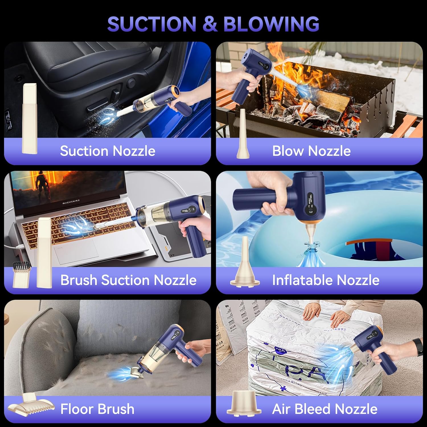 Seven versatile attachments for deep cleaning across cars, sofas, mattresses, and offices