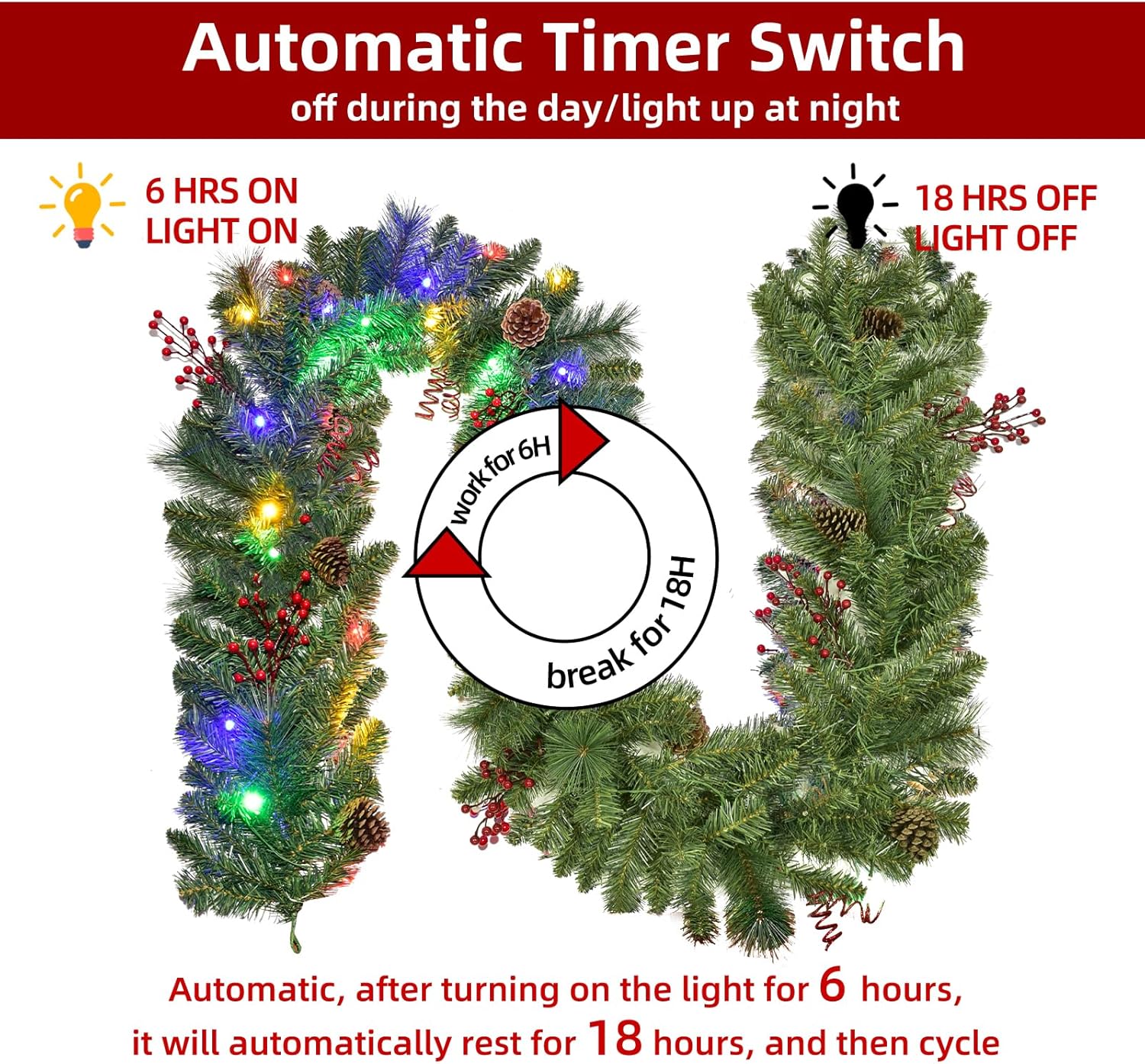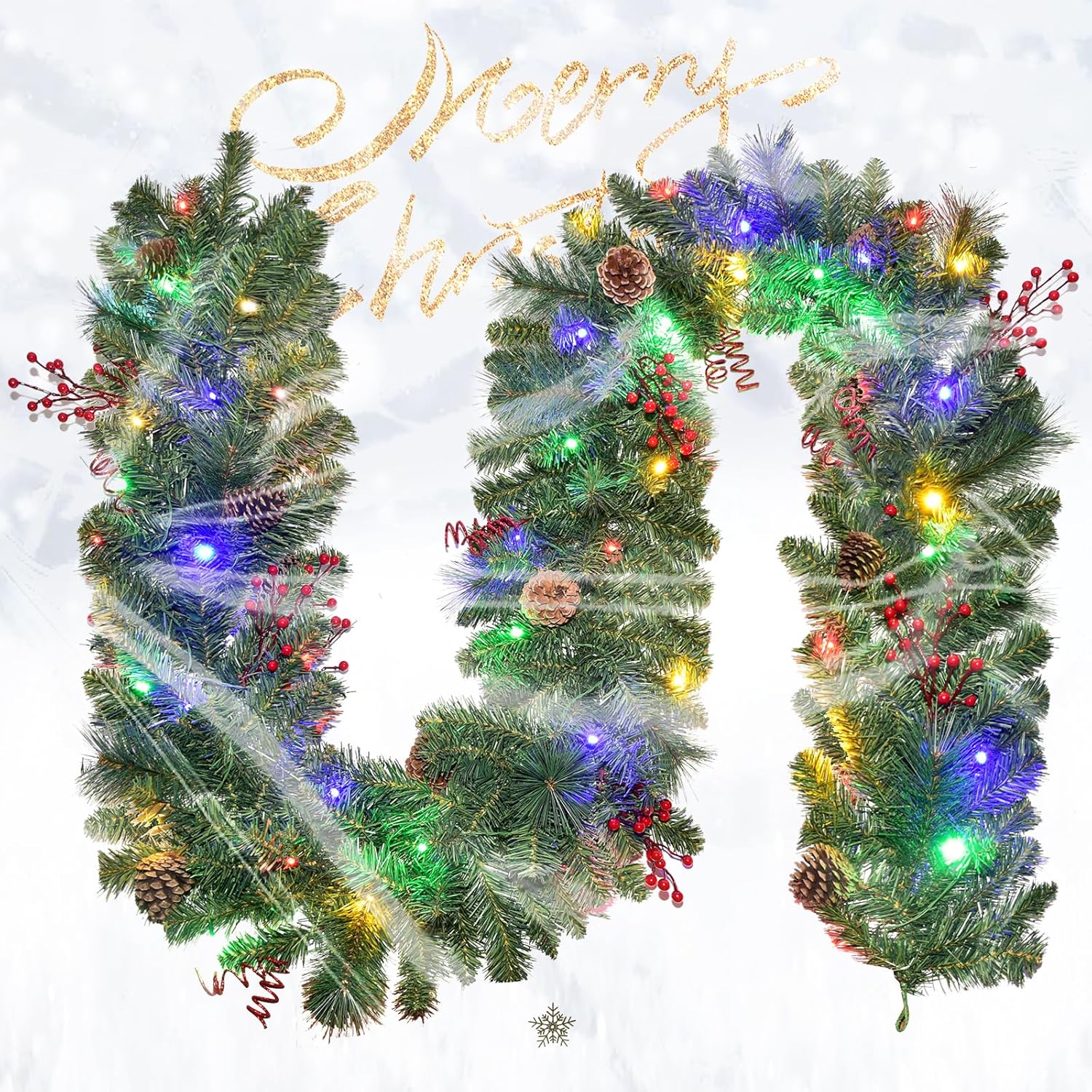 Our 9-foot Christmas garland is designed to elevate your holiday décor with lush foliage, premium PVC construction, and built-in warm white LED lights. Crafted for both indoor and outdoor displays, this garland maintains its full length without shedding or sagging, making it ideal for stair railings, mantels, door frames, table centerpieces, and festive event styling. Featuring 50 battery-powered LED lights with 8 lighting modes, it offers flexible placement without relying on power outlets, while its natural appearance with red berries and pine cones adds timeless seasonal elegance.