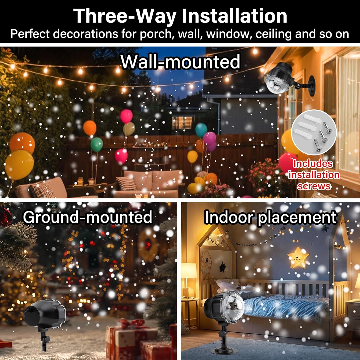 Romantic Snowfall Effect: Combines falling and large static snowflakes to create a magical, white Christmas atmosphere anywhere.