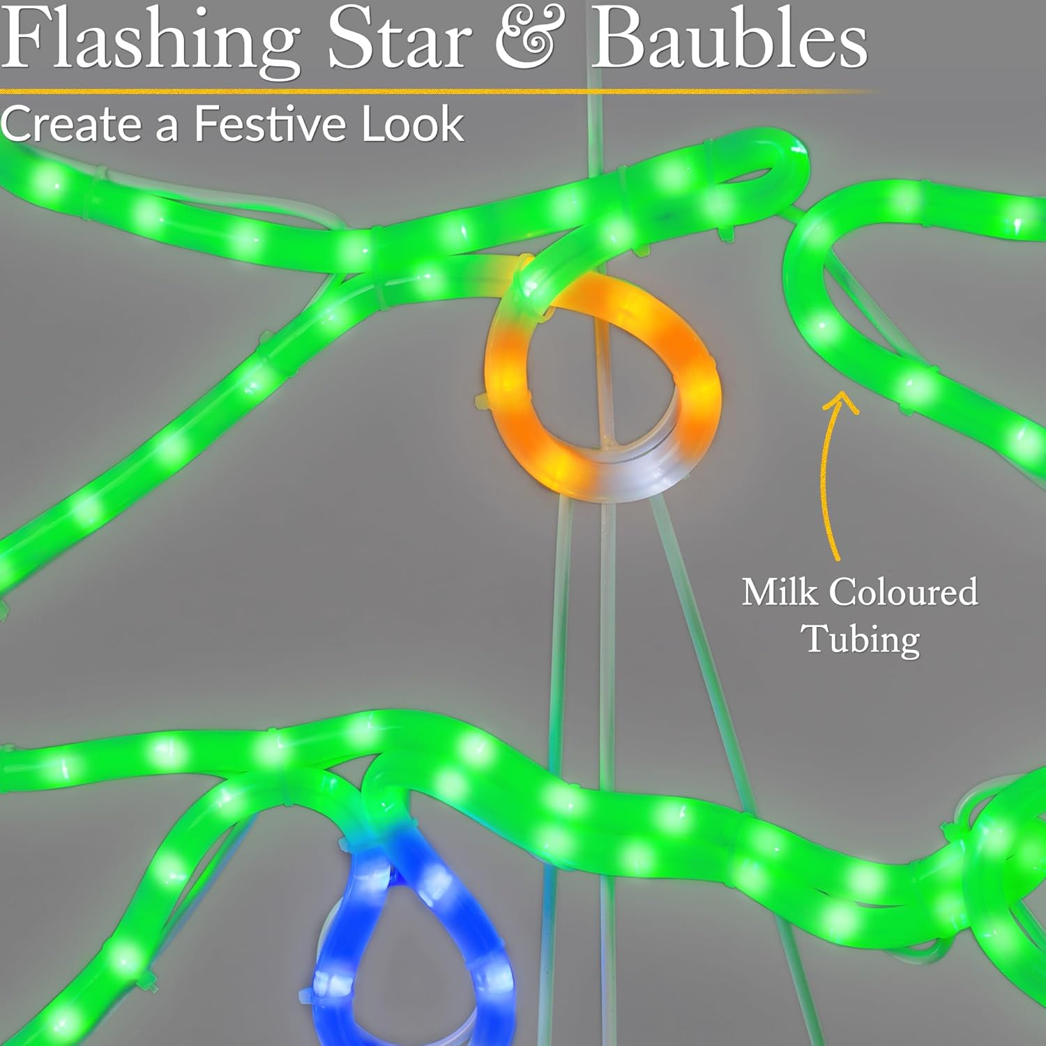 Twinkling star and baubles with white flashing LEDs create a magical effect