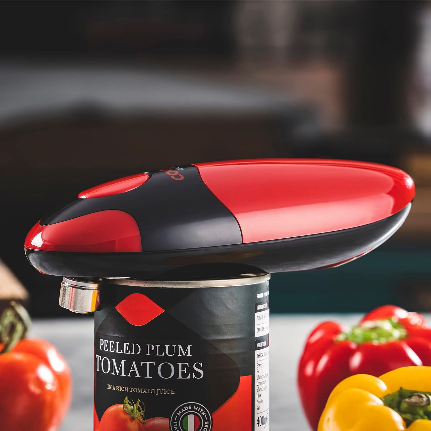 Enjoy a safer kitchen experience with its smooth-edge lid removal feature, where the built-in magnet lifts the lid cleanly, reducing the risk of cuts. The compact and stylish red and black design fits seamlessly into any kitchen décor, while its battery-powered operation provides cordless convenience, ideal for kitchens, picnics, or outdoor use.