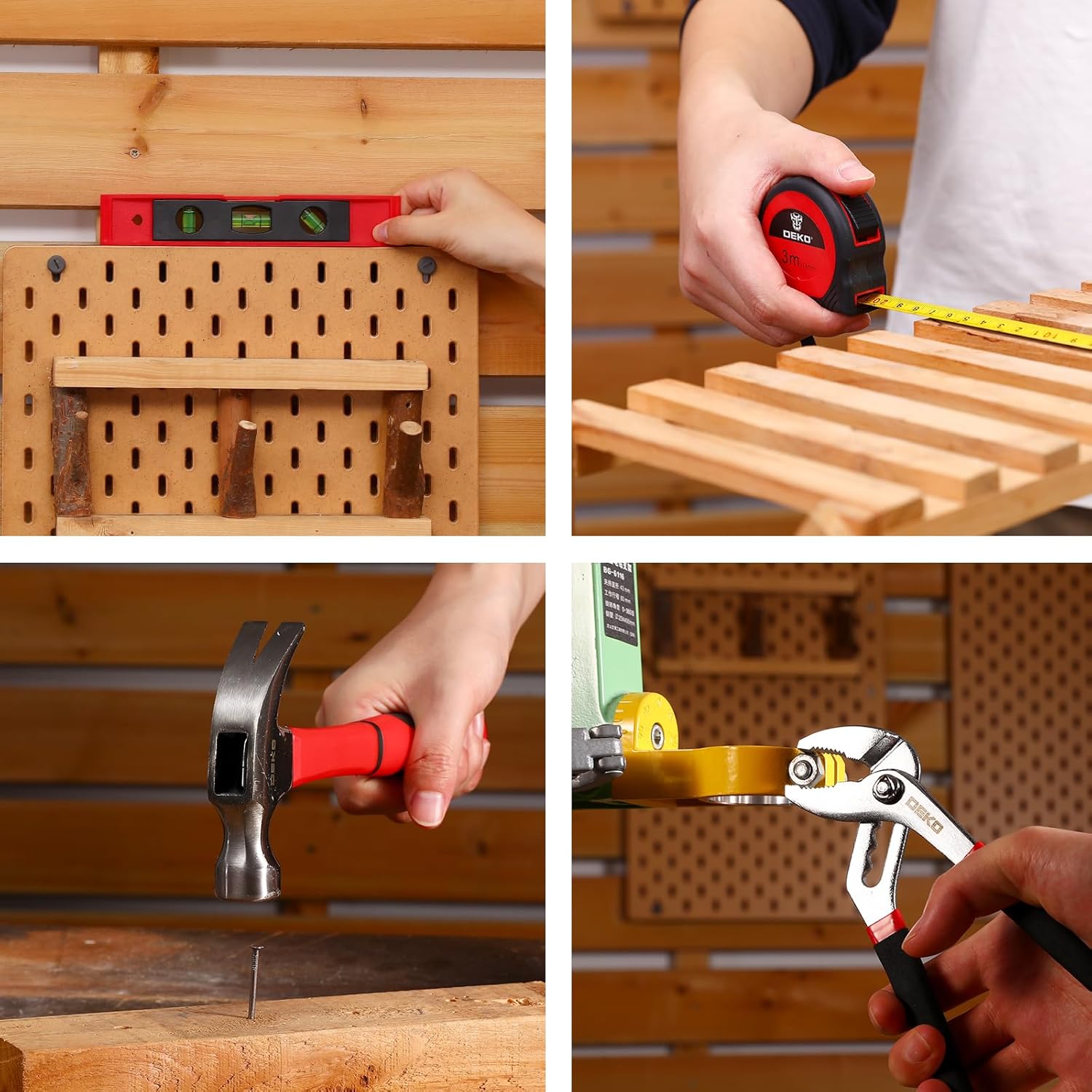 Our DEKO 20V Cordless Drill Tool Kit with 186 Pieces including 20V DEKO Power Drill, 1.5Ah Lithium-ion Battery, Type-C Charger, Screwdrivers, Bits, Sockets, Hammer, Wrenches, Pliers, Tape Measure, and Portable Toolbox is ideal for home repairs, DIY projects, and furniture assembly. The 20V cordless drill features a 1.5Ah rechargeable Lithium-ion battery that fully charges in 1.5 hours, providing 1–3 hours of continuous use, with a maximum no-load speed of 1350 r/min. All tools are stored in a compact and sturdy red plastic toolbox for organized storage and portability, making it suitable for men and women handling multi-functional household tasks.