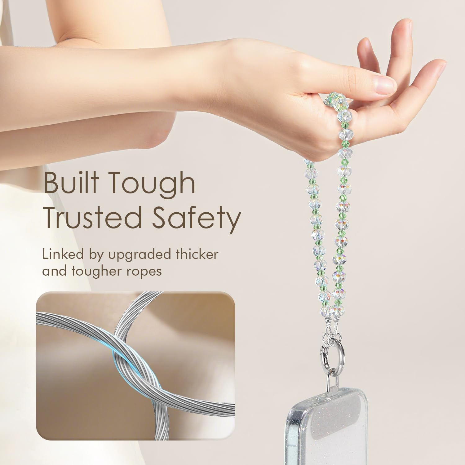 Our crystal glitter phone charm is designed to add elegance, convenience, and anti-loss security to your daily carry, combining sparkling crystal beads with a durable steel-wire core. This wrist lanyard strap attaches easily to compatible phone cases, bags, keys, or accessories, offering a stylish and functional way to keep essentials close while maintaining effortless charging access through its tether tab connection.