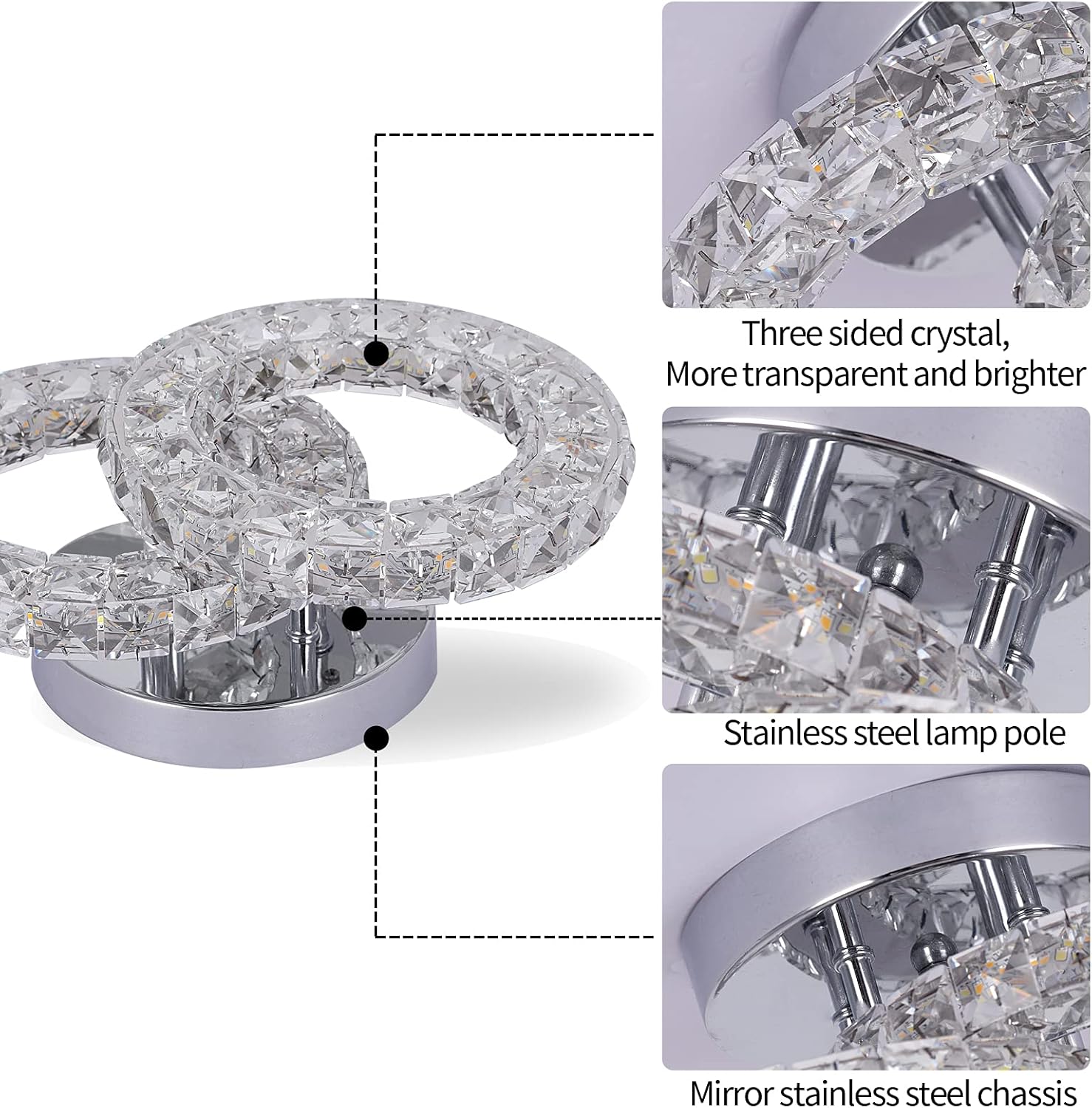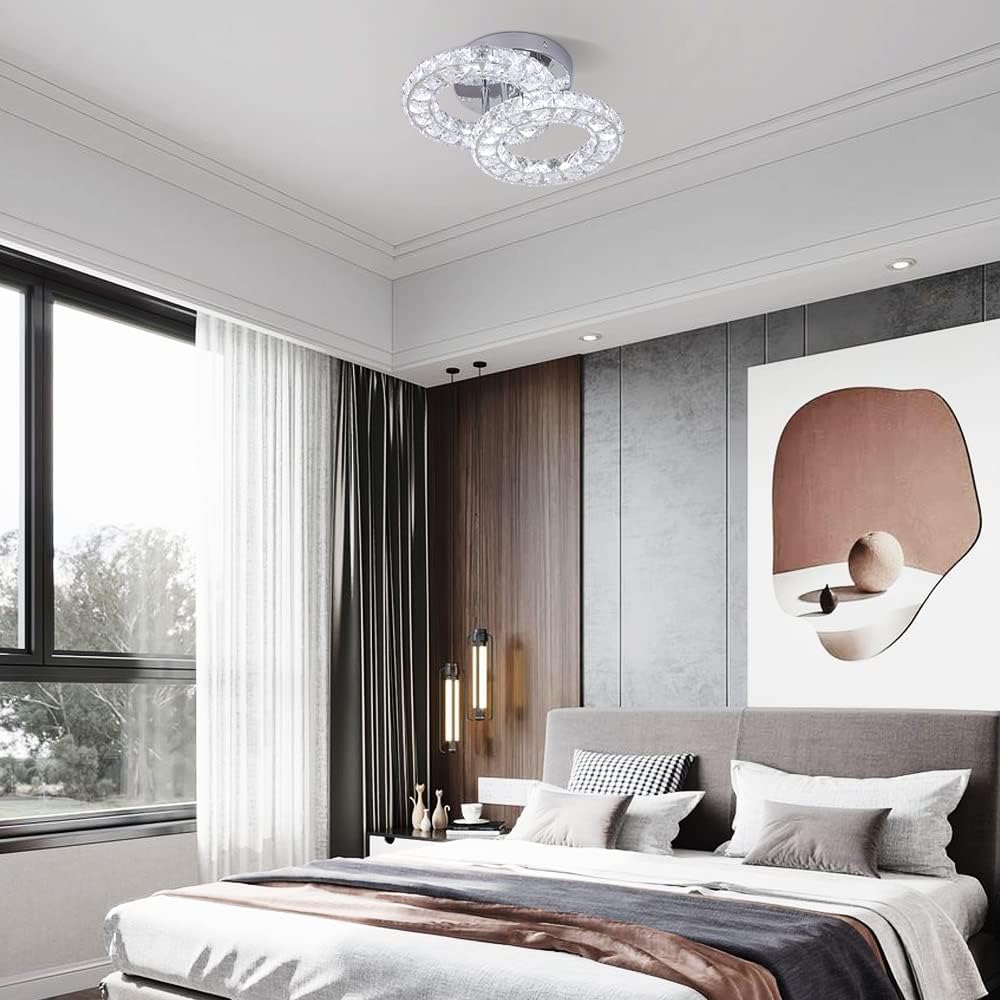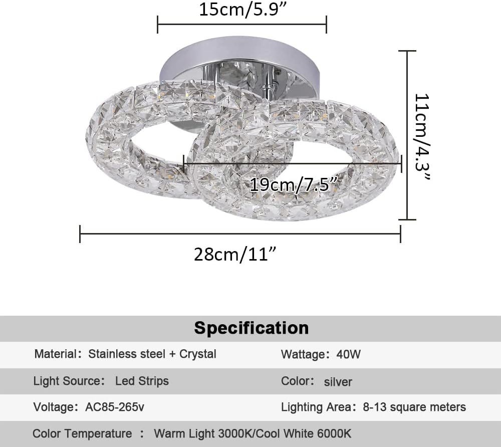 Upgrade your home with this stunning 2-ring crystal chandelier light fixture, designed with a sleek stainless steel frame and sparkling crystal accents. This modern LED ceiling light features three color temperature modes—warm white, neutral light, and cool white—allowing you to set the perfect ambiance for any room. The chrome finish and contemporary design make it a versatile lighting solution that complements bedrooms, staircases, aisles, kitchens, dining areas, and more. With energy-efficient LED technology, this chandelier not only provides brilliant illumination but also helps reduce electricity costs. Crafted from premium crystal, glass, and stainless steel, this flush mount ceiling light adds a luxurious touch to your living space while ensuring durability and long-lasting performance.