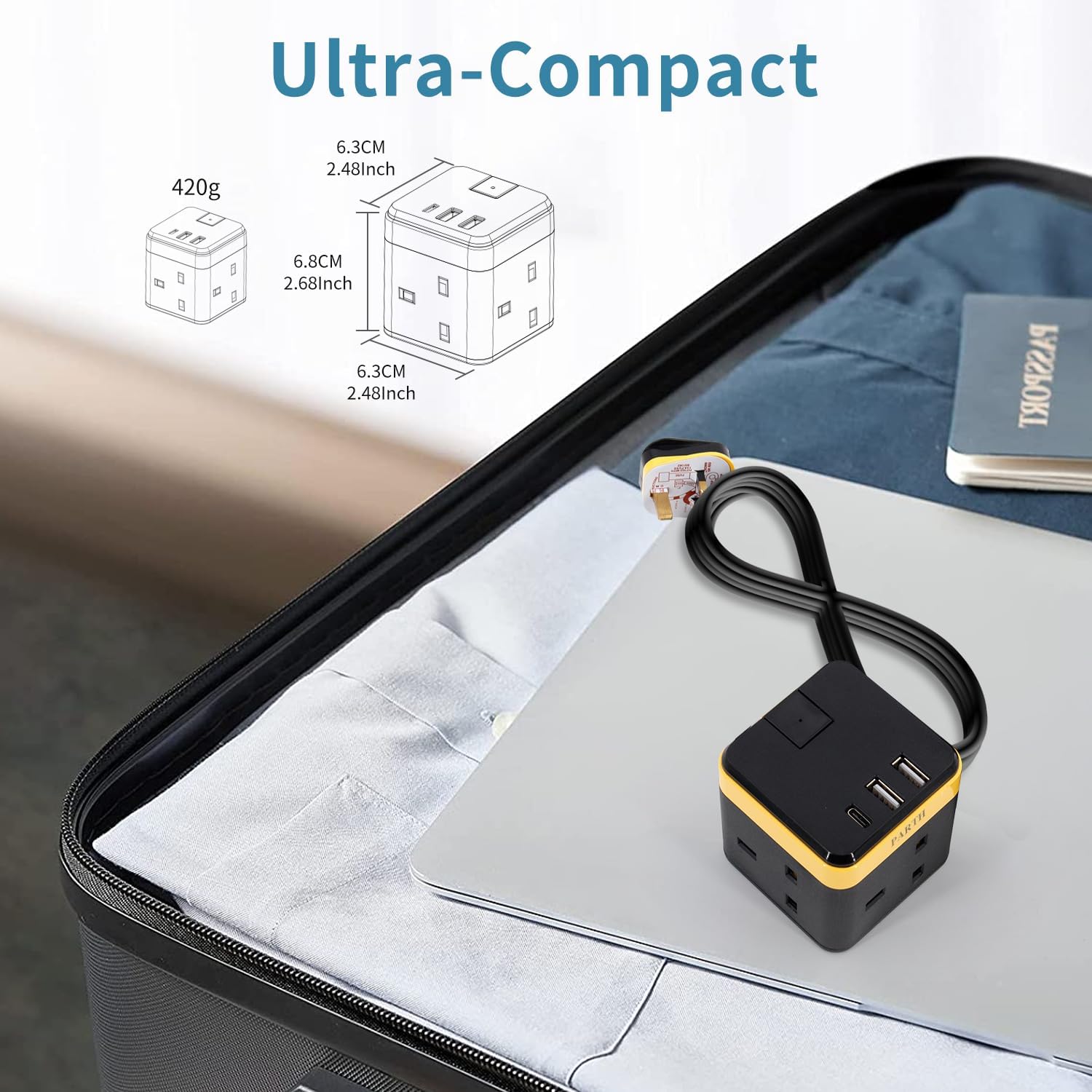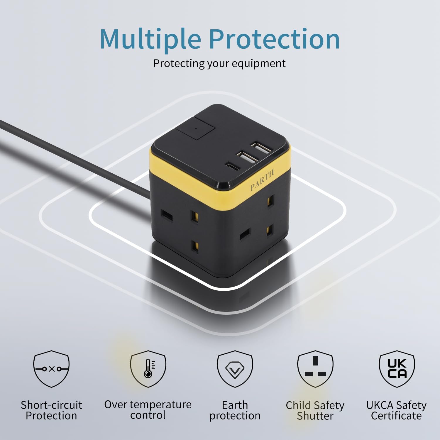 Cube Extension Lead with USB C & 2 USB A, 3 Way Power Strip 2M 13A