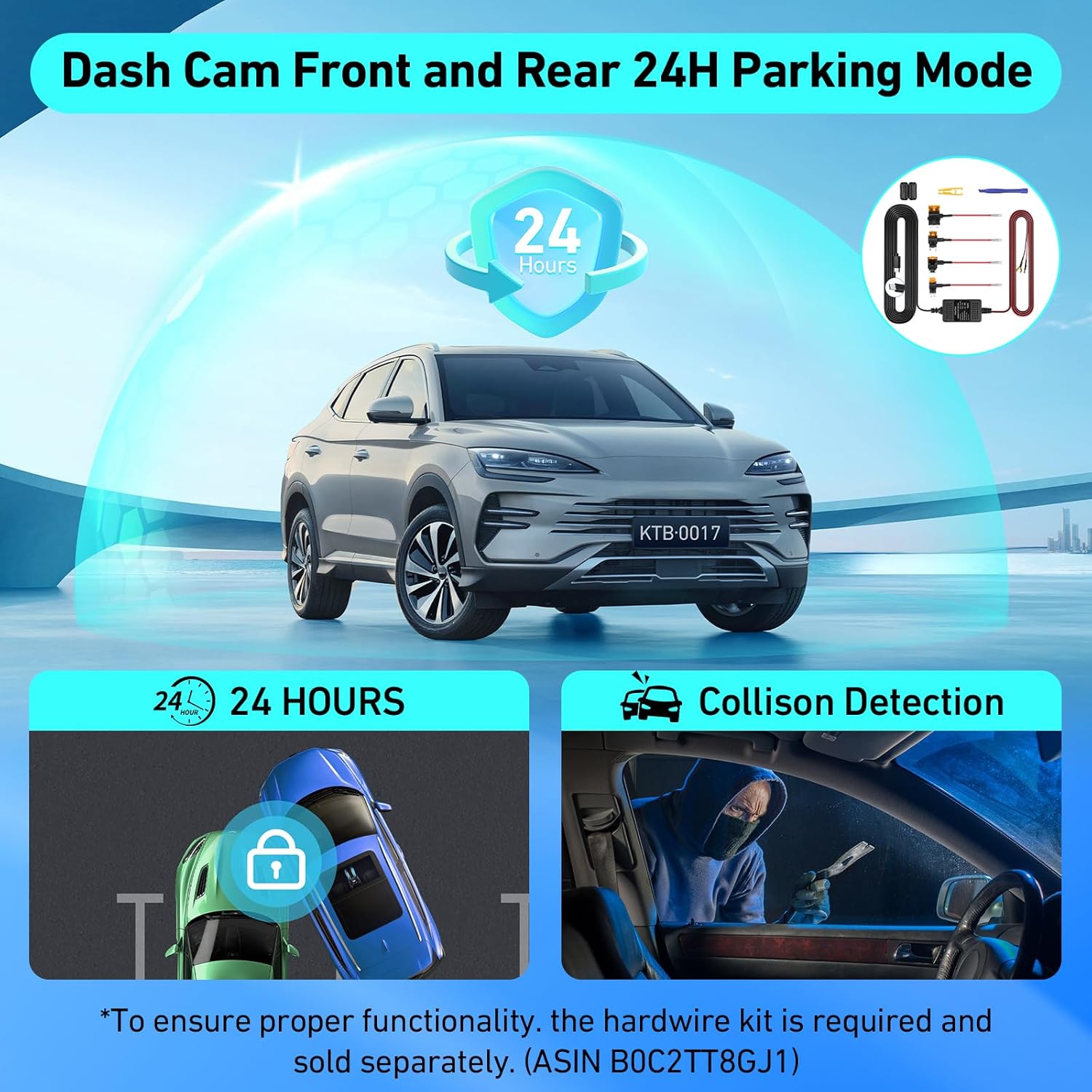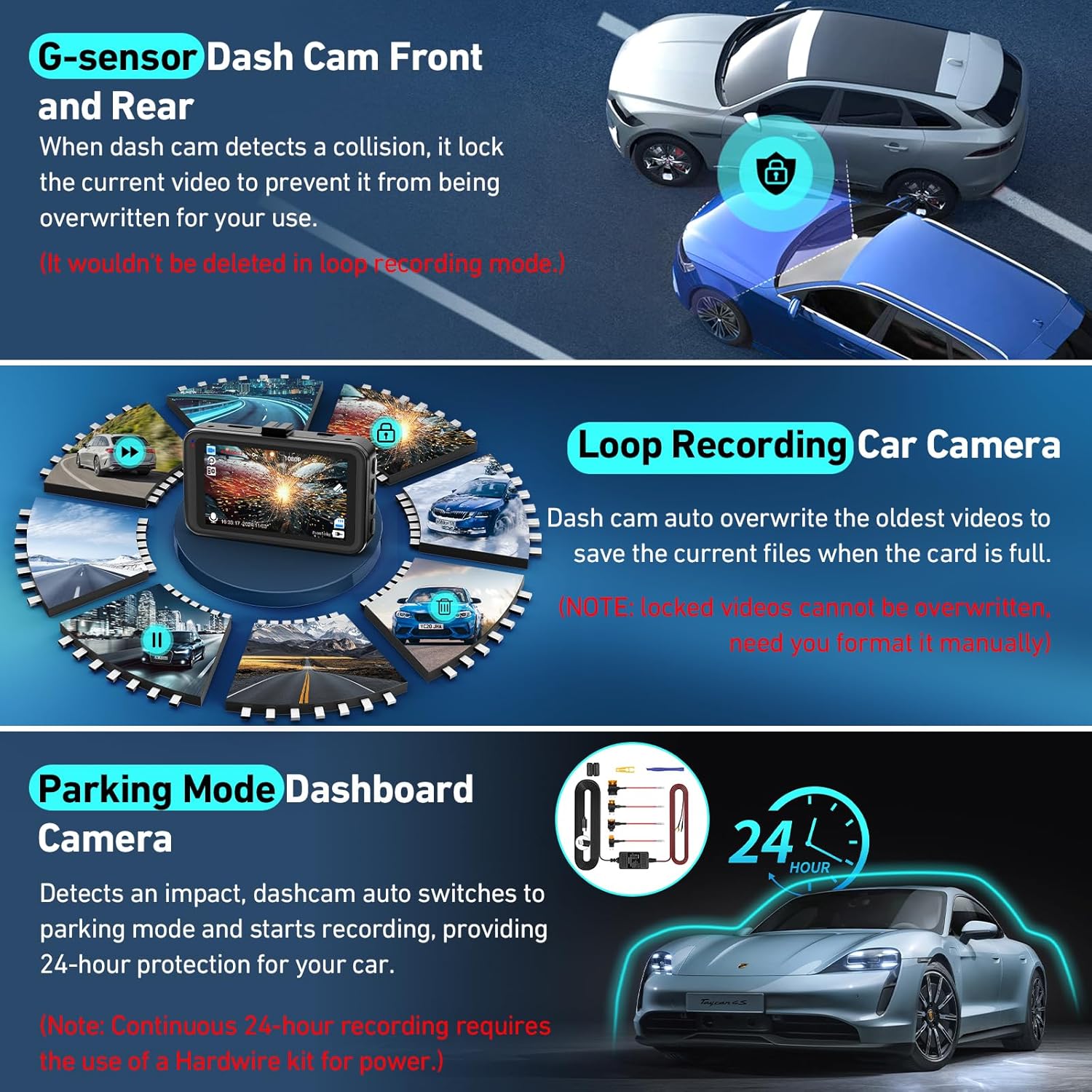 Equipped with WDR and F/1.8 aperture night vision, this dual dash cam ensures sharp details even in low-light conditions. The G-Sensor automatically locks critical videos in the event of collisions, while Loop Recording continuously overwrites old files for uninterrupted performance. When parked, the Parking Monitor activates to record impact events for added protection.