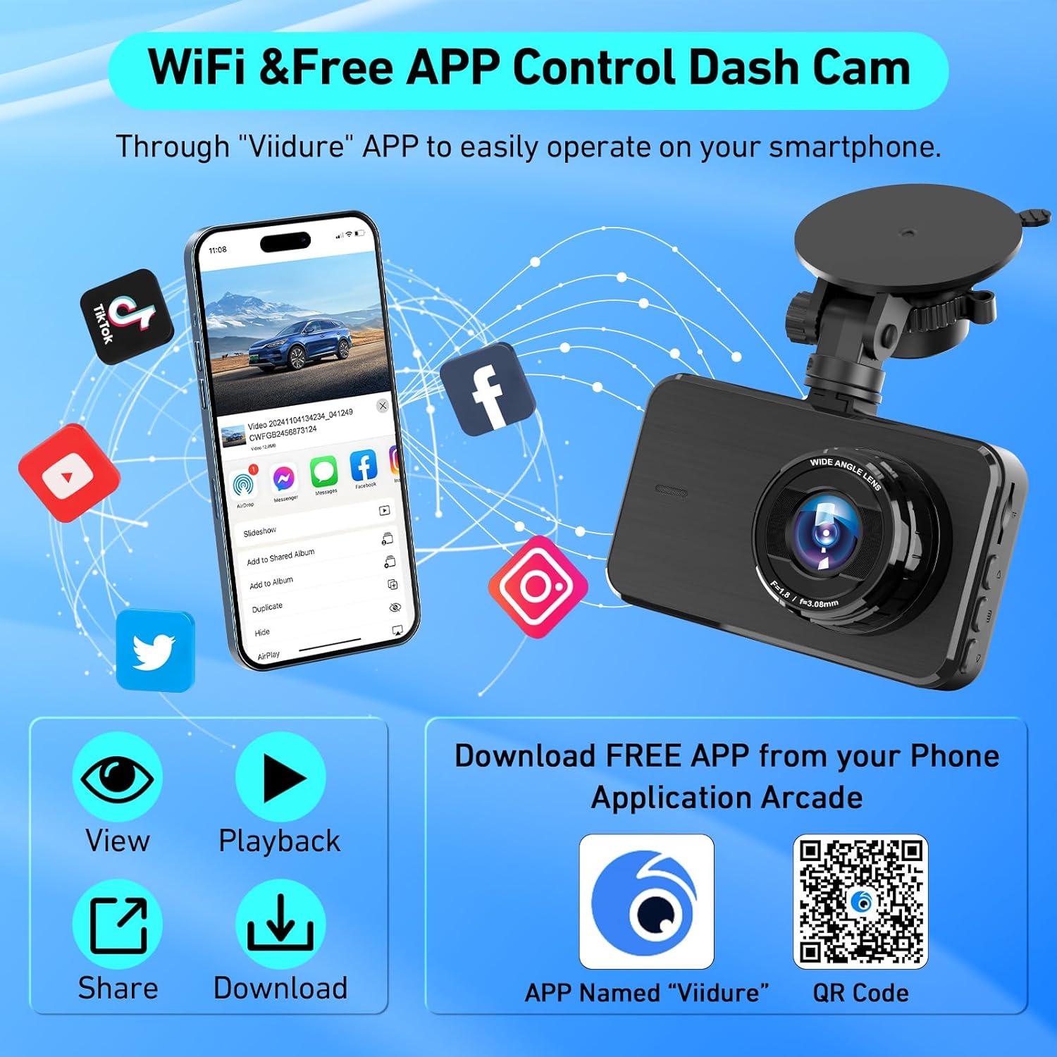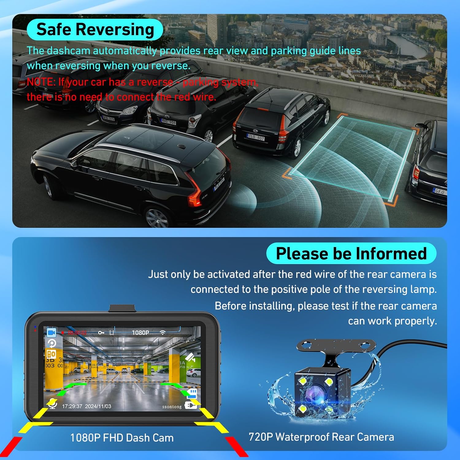Our Dash Cam Front and Rear 1080P Dual Lens delivers crystal-clear video coverage for total driving security. With built-in WiFi and full app control, you can preview, download, and share footage instantly on your smartphone. The 170° front and 140° rear wide-angle lenses record every moment in Full HD 1080P, ensuring your journey is captured from every angle.