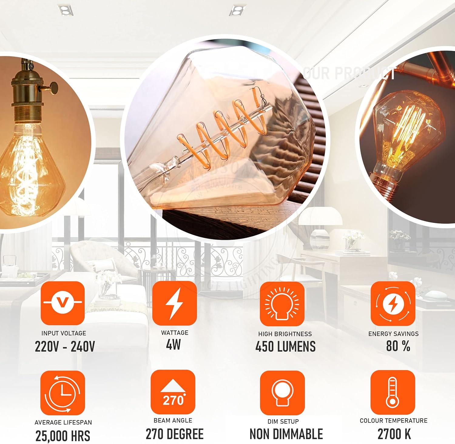 Our decorative diamond glass LED Edison light bulb with E27 base, 4W power output, warm 2700K ambient light, spiral filament design, non-dimmable performance, and vintage nostalgic styling is designed to deliver soft, eye-comfort lighting for home décor applications, combining energy efficiency with a classic aesthetic ideal for pendant lights, chandeliers, table lamps, floor lamps, and ceiling fan fixtures.