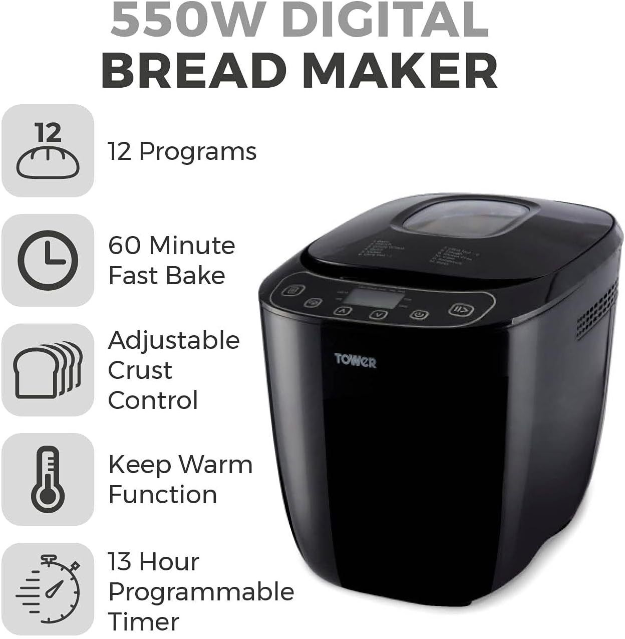 Our Digital Bread Maker 550W is designed to bring the aroma of freshly baked bread straight to your kitchen. With 12 pre-set programs, it allows you to effortlessly prepare white, wholemeal, gluten-free bread and even dough for pizzas and rolls. The 13-hour delay timer lets you set it overnight so you can wake up to a warm loaf, while the 60-minute keep warm function maintains ideal serving temperature. The non-stick bread pan ensures easy release and cleaning, and adjustable crust control lets you customise your bake to perfection. Ideal for everyday family use or weekend baking sessions.