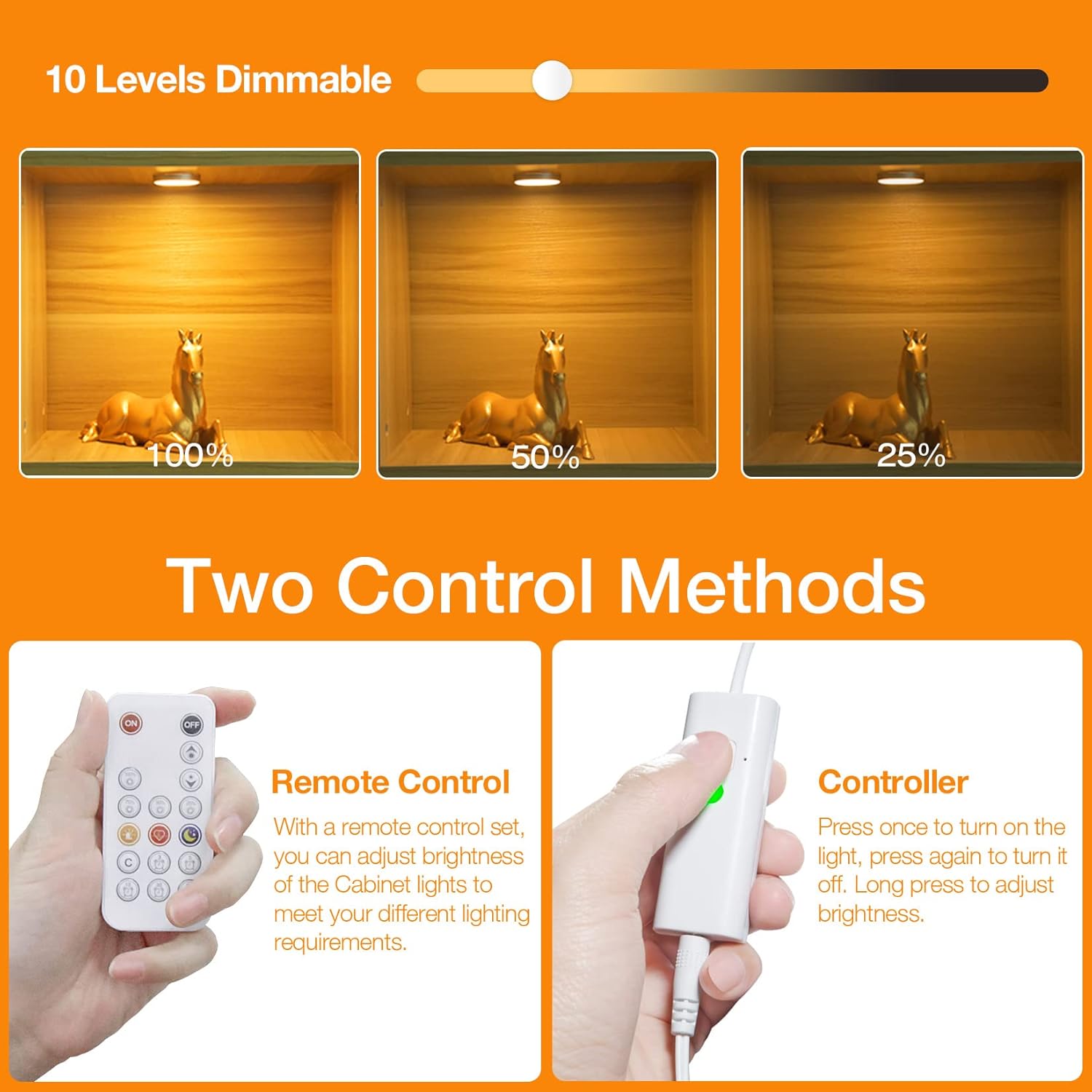 Enhance your home lighting with this set of dimmable under cabinet kitchen lights, designed for modern convenience and versatile use. Featuring a 17-key RF remote, these LED puck lights allow you to adjust brightness, set timers, and enjoy memory function for customised illumination. Each light delivers 175 lumens, totalling 700 lumens of warm white brightness—perfect for kitchens, closets, shelves, and bookcases. Built with low-voltage DC24V power supply, they ensure safe operation, low energy consumption, and long service life. Easy to install with strong adhesive backing, these LED counter lights require no drilling and keep your space clean and tidy. Ideal for adding task lighting, ambience, or decorative accents in any room.