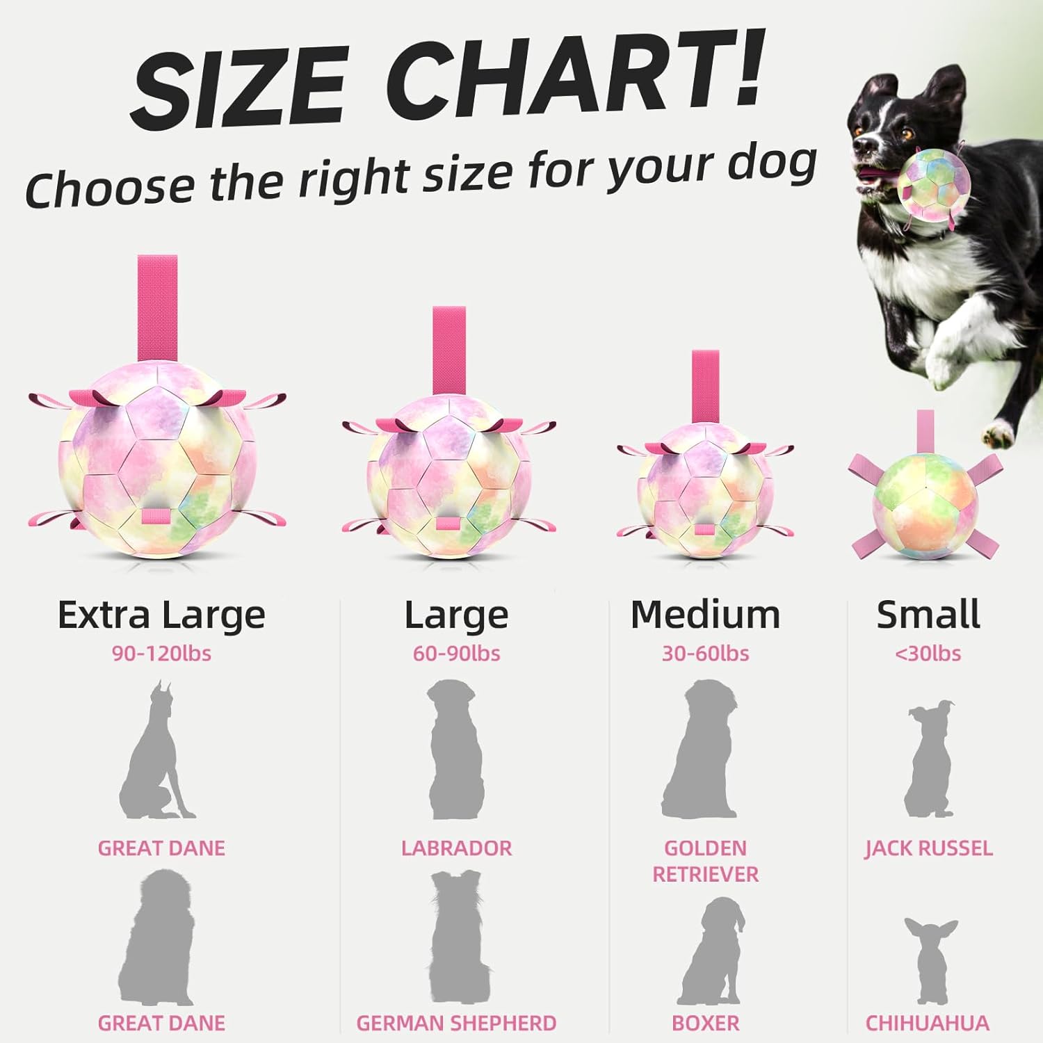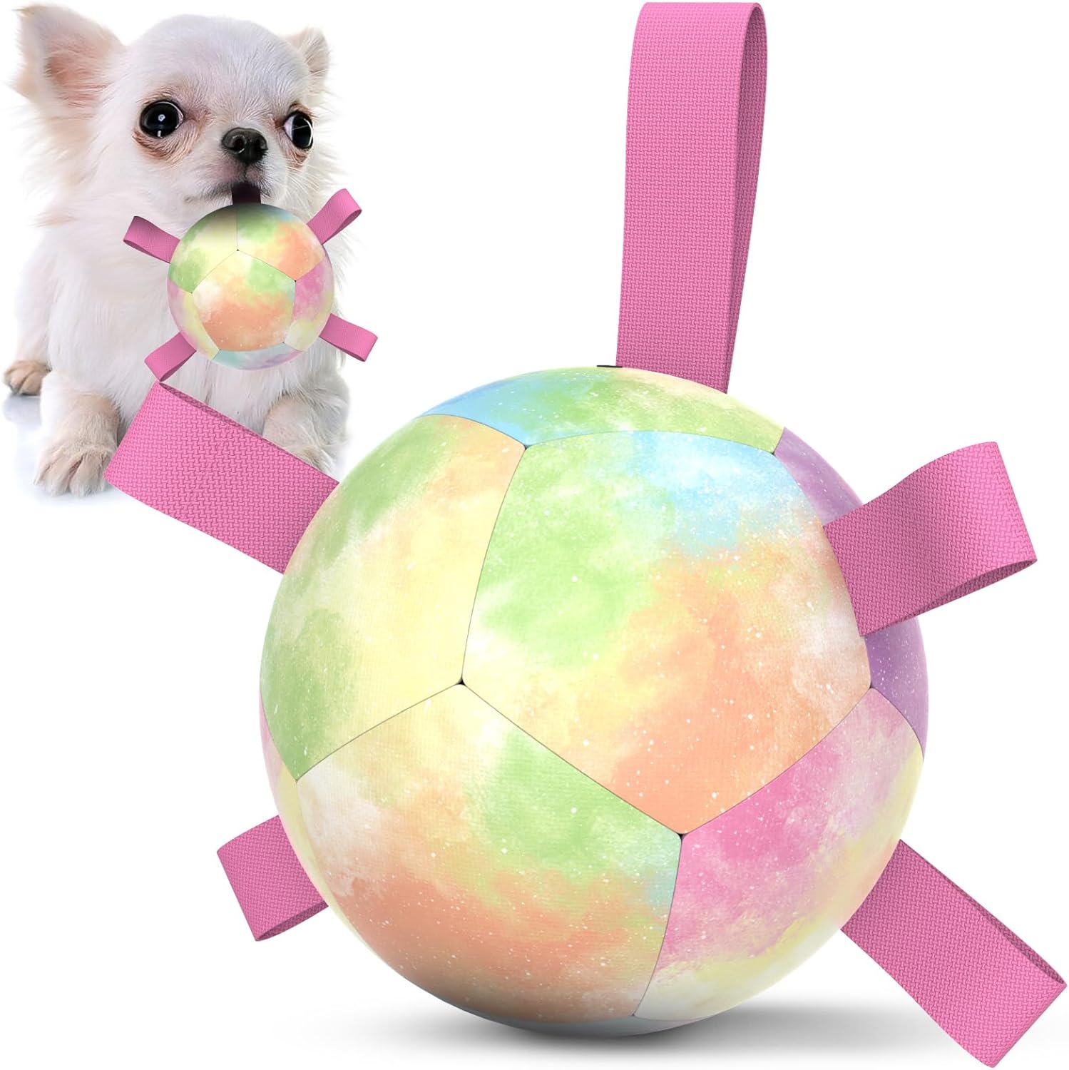 Our dog soccer ball toy is designed to help dogs release energy, stay active, and improve intelligence while reducing boredom, anxiety, and loneliness. Made from premium PU material that meets children’s toy safety standards, this durable and soft ball is suitable for small and medium dogs up to 30lbs. Its lightweight build and evenly stitched nylon straps create engaging bounce patterns while making it easy for dogs to fetch, tug, and retrieve both indoors and outdoors, including water play at pools, lakes, and beaches. With its colorful design and interactive features, this ball provides a fun and reliable way to keep your pet happy, stimulated, and healthy.
