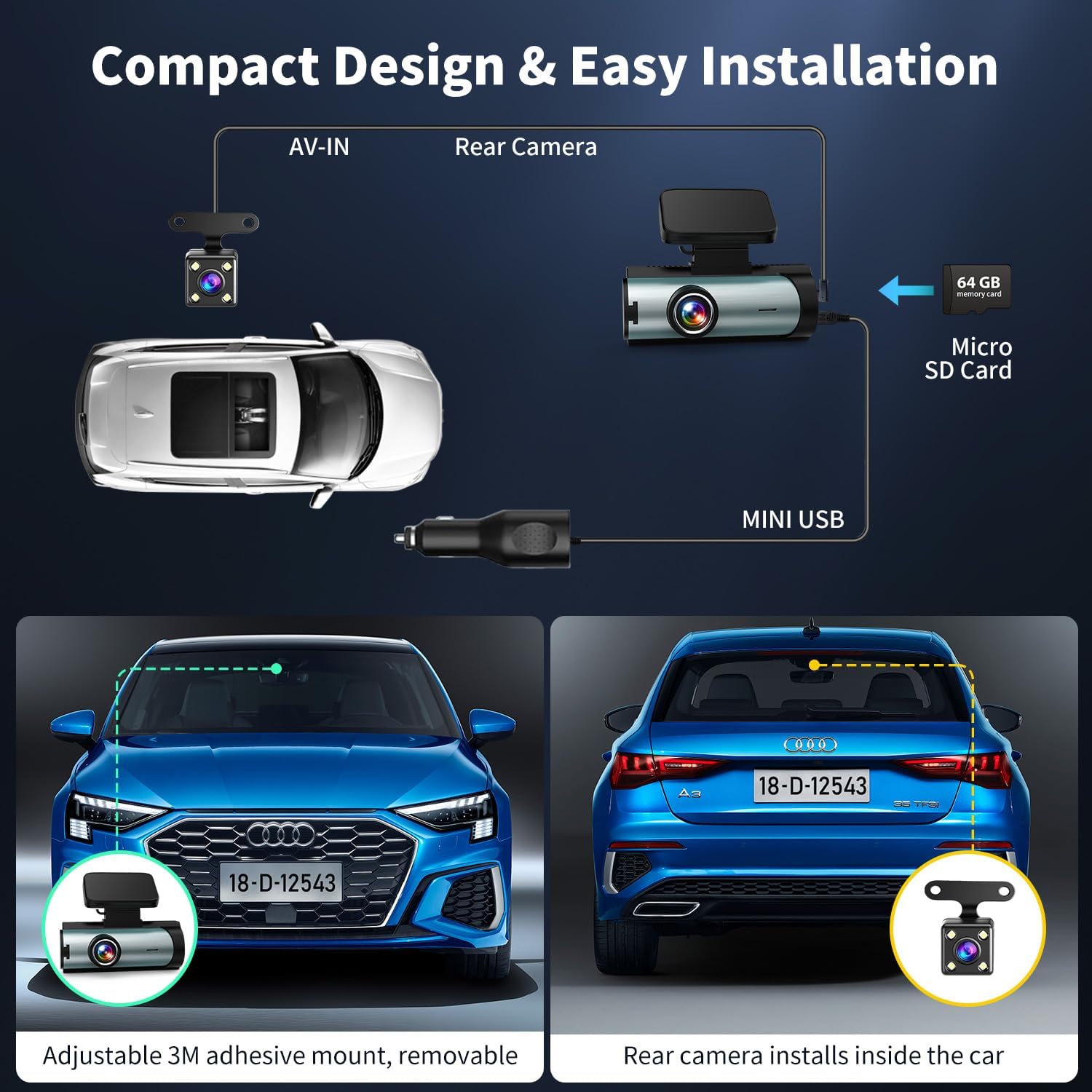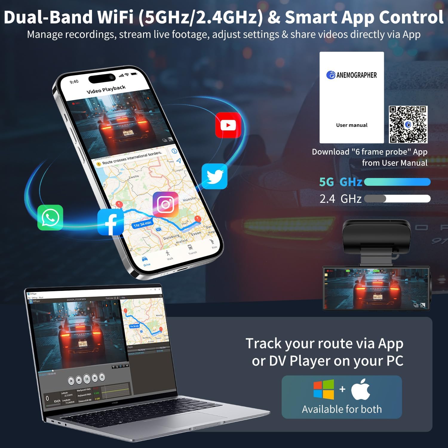 Our Dual Dash Cam Front and Rear delivers ultra-clear UHD front footage and 1080P rear video for comprehensive driving coverage. Designed for cars, vans, and trucks, this dashcam captures every detail with a 170° wide-angle lens, advanced WDR night vision, and F1.8 aperture for superior clarity day or night. With built-in Wi-Fi, you can easily connect to your smartphone via the “6 Frame Probe” app for live streaming, playback, and sharing. The 3" IPS display offers intuitive control, while features like loop recording, G-sensor emergency lock, and time-lapse mode ensure continuous, reliable protection on the road. Includes a 64GB SD card for instant use.