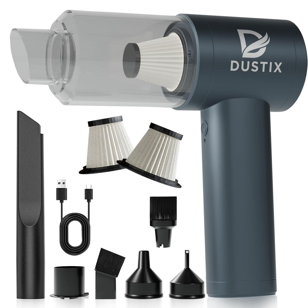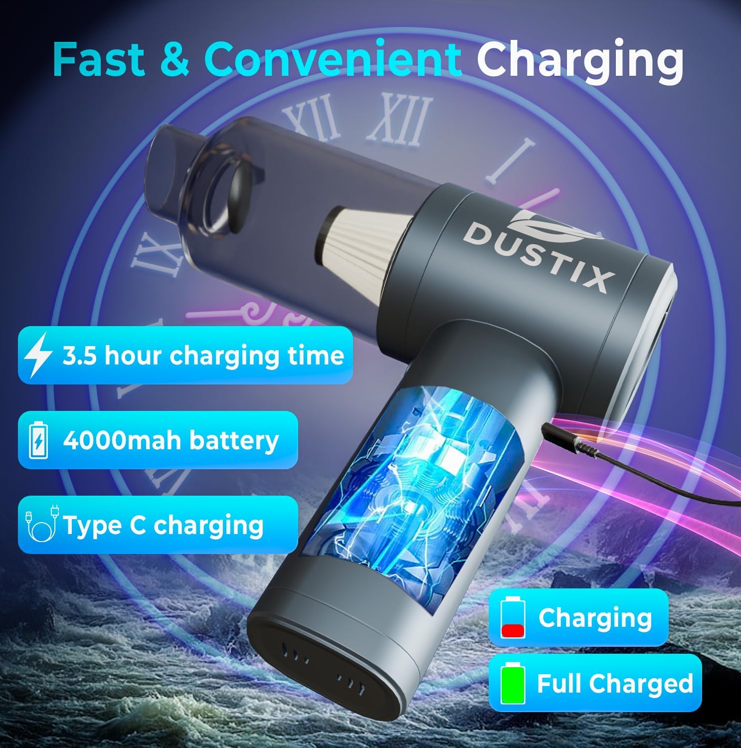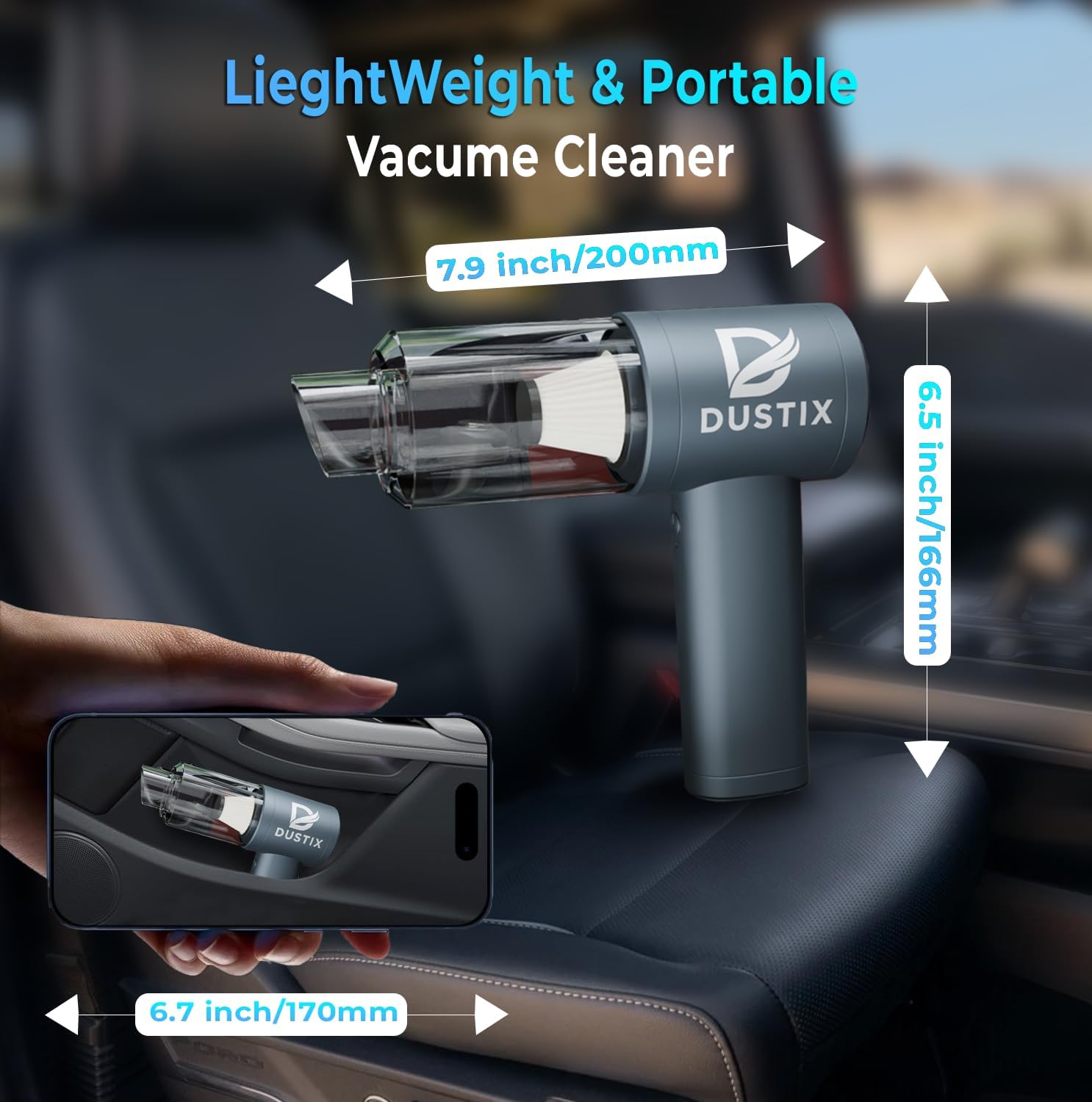 Our DUSTIX Cordless Handheld Vacuum Cleaner delivers powerful 12 000 Pa suction performance in a compact, lightweight design, making it perfect for cleaning cars, offices, homes, and kitchens. Featuring dual gear suction with a brushless motor for efficient and long-lasting use, this portable mini vacuum offers both vacuum and blower functions for versatile cleaning. With a 4 000 mAh dual battery system providing up to 20 minutes of runtime and quick Type-C recharging, it ensures convenience wherever you need deep, precise cleaning.