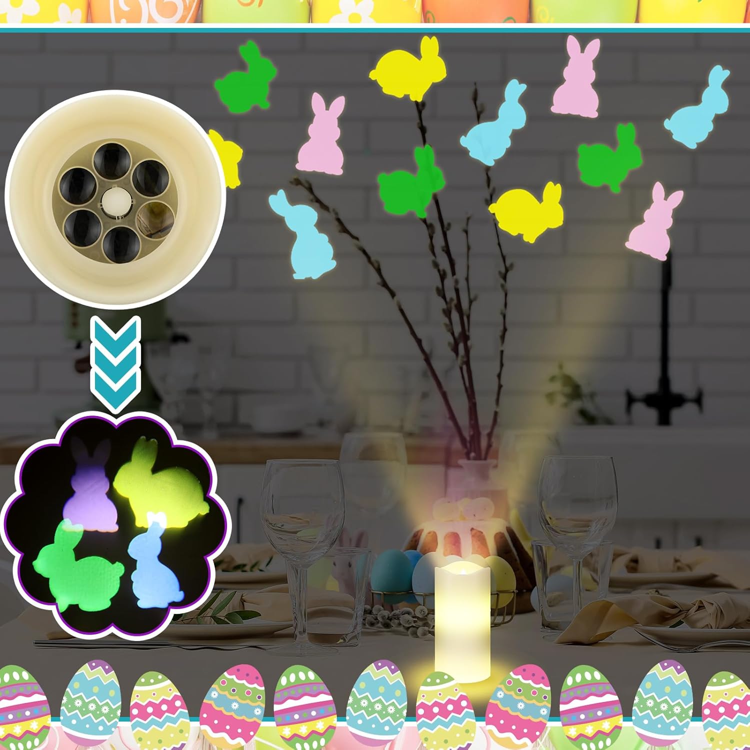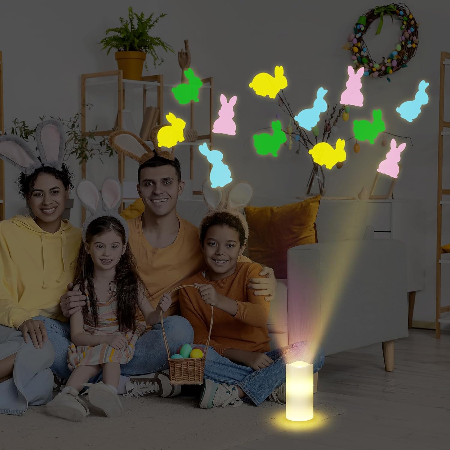 Add a playful and festive glow to your spring décor with this Easter bunny flameless LED candle featuring a built-in rotating projector. Designed to create a cheerful atmosphere, the candle combines soft ambient lighting with colorful bunny projections that gently rotate and overlap, bringing life to your space.