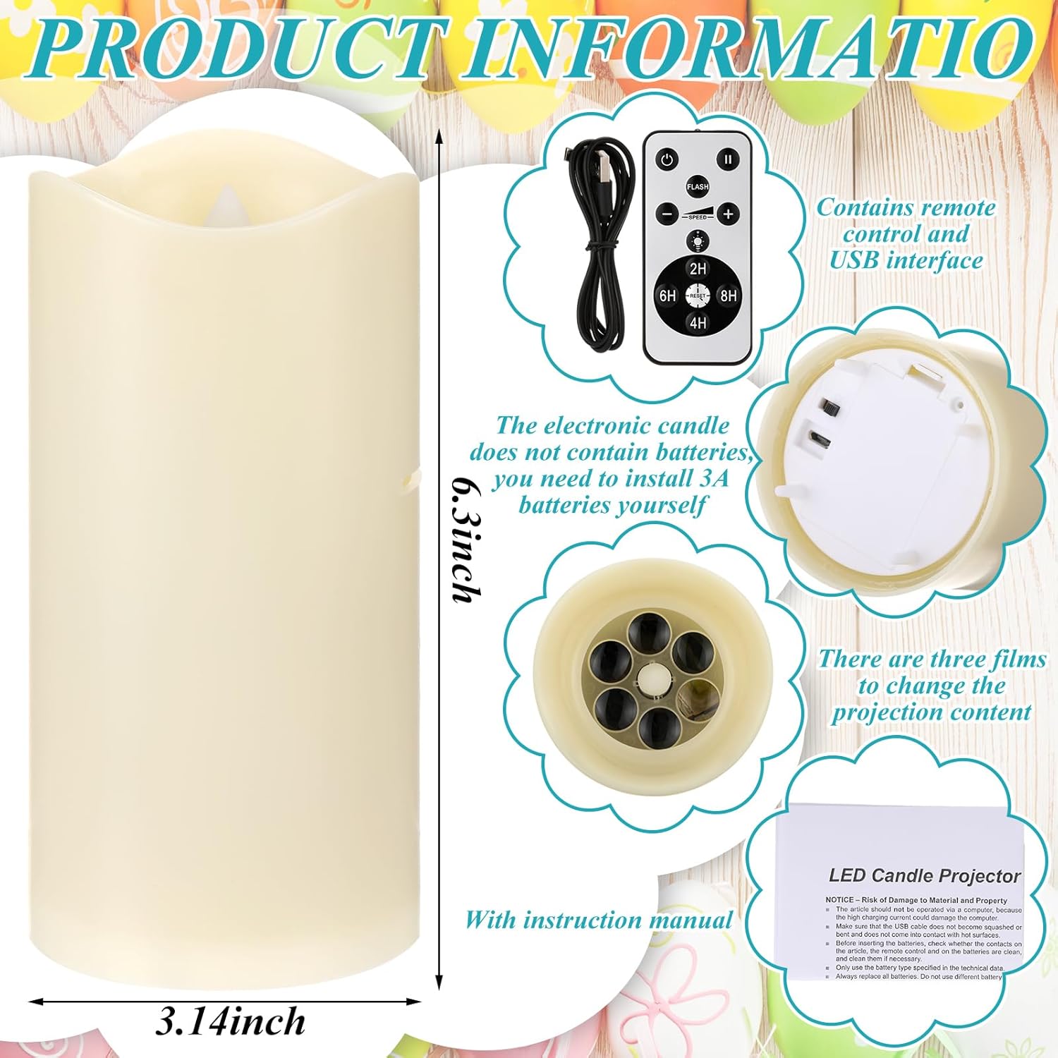Made from durable plastic, this decorative LED candle is safe, flameless, and ideal for tabletops, shelves, and decorative displays. The included projection films allow you to switch between different visual effects, projecting charming bunny patterns onto ceilings or walls for an engaging nighttime display.
