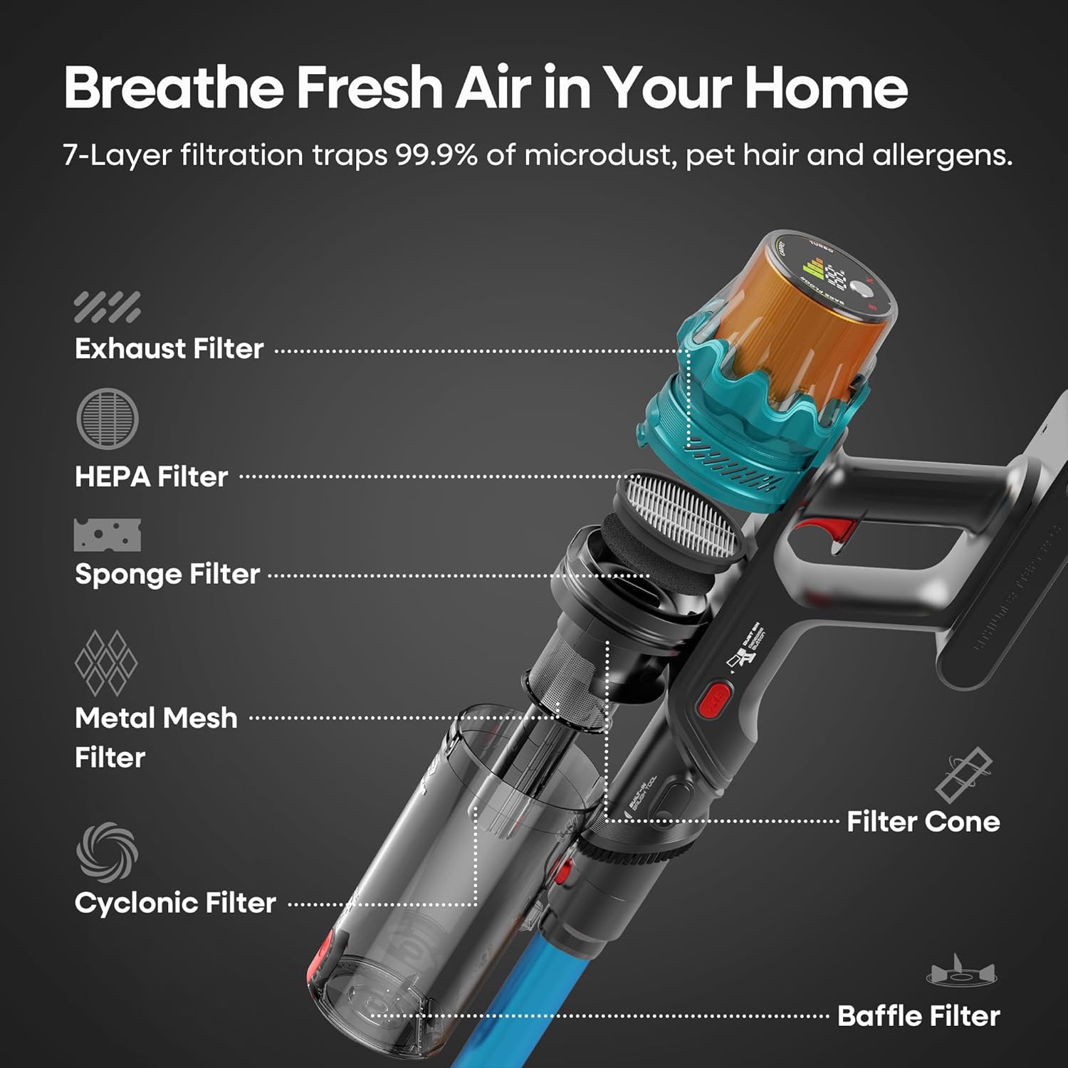 【7-Level Filtration System】 Multi-stage filtration including HEPA and metal filters captures 99.99% of dust, pollen, and bacteria, ensuring cleaner air and healthier living.