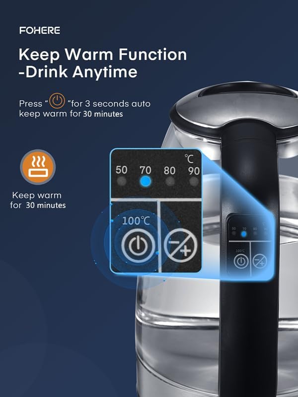Our powerful 1.7L FOHERE Glass Electric Kettle delivers 2200W fast and quiet boiling, making it perfect for preparing tea, coffee, oatmeal, and hot beverages in minutes. Designed with five vibrant LED colors that change with water temperature, it brings both functionality and modern style to your kitchen.
