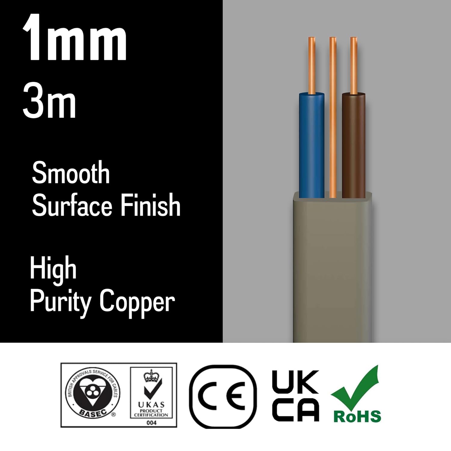 Our 1mm Twin and Earth flat grey PVC electric cable is designed for safe and reliable use in domestic electrical installations, including lighting circuits, ring mains, and electrical sockets. Manufactured with copper conductors and BASEC approved to UKAS certification standards, this 6242Y electrical wire is cut to a convenient 3 metre length and delivers dependable performance for a wide range of household wiring applications such as sockets, radial circuits, immersion heaters, boilers, and plugs.