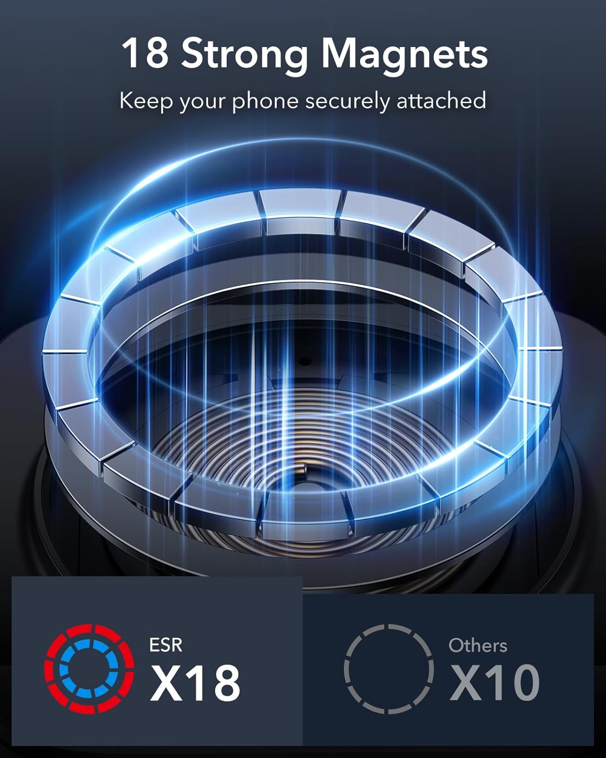 Charge your iPhone or Galaxy S25 effortlessly with the ESR 15W MagSafe Car Mount Charger, designed for fast, secure, and convenient wireless charging. Equipped with intelligent heat management, this charger ensures optimal charging speed almost identical to official MagSafe chargers when paired with an 18W QC adapter (not included). The powerful magnetic lock and non-slip silicone ring keep your phone firmly in place, even on bumpy roads. Effortlessly switch between portrait and landscape mode for navigation and enjoy flexible positioning with the adjustable ball joint. Compatible with iPhone 17/16/15/14/13/12 series and Galaxy S25 series magnetic cases, this charger provides a seamless, one-handed experience. Enhance your driving convenience with the ESR HaloLock Dashboard Wireless Charger, combining premium quality, ease of use, and stylish design.
