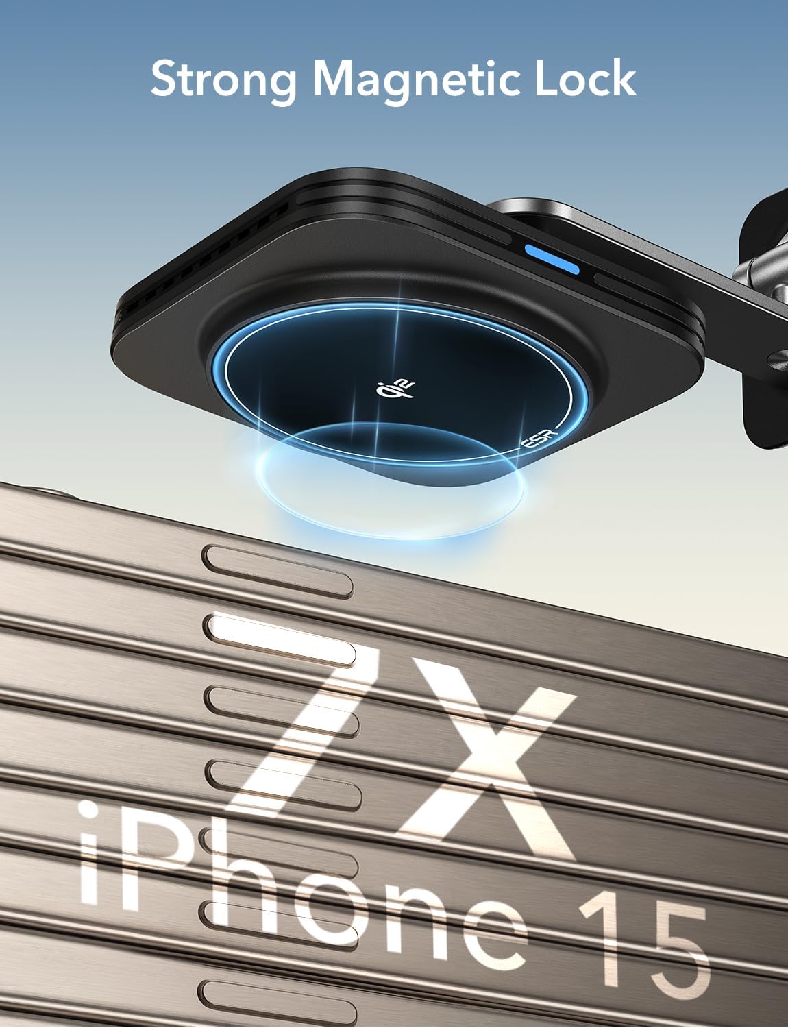 Experience the ultimate wireless charging convenience with the ESR Qi2 15W MagSafe Car Mount Charger. Designed specifically for iPhone 12 to 17 series, Galaxy S25, and Pixel 10 series, this Qi2-certified car charger guarantees fast, reliable, and safe charging. Its strong magnetic lock with 1,600 gf holding force keeps your device firmly in place, even on bumpy roads, while the adjustable 270° extension arm and 360° rotation base provide optimal viewing angles for navigation and calls. Equipped with a large 3M adhesive pad, it securely mounts to curved or uneven dashboards. The charger is compatible with official or ESR magnetic cases for best performance. Ideal for any driver seeking a sleek, safe, and high-speed magnetic car phone holder.