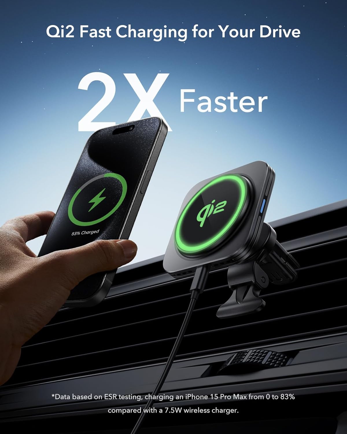 Our ESR Qi2 15W MagSafe Car Mount Charger provides fast, reliable, and Qi2-certified wireless charging for your iPhone, Galaxy, and Pixel devices. Featuring a strong 1,600 gf magnetic lock, it securely holds your phone even on bumpy roads. Designed for flexible use, you can mount it on your car’s air vent or dashboard with exceptional stability. The 15W power output ensures efficient charging while allowing easy portrait or landscape viewing for navigation. Compatible with magnetic cases and backed by complete customer support, this charger offers both performance and peace of mind for daily commutes or long drives.