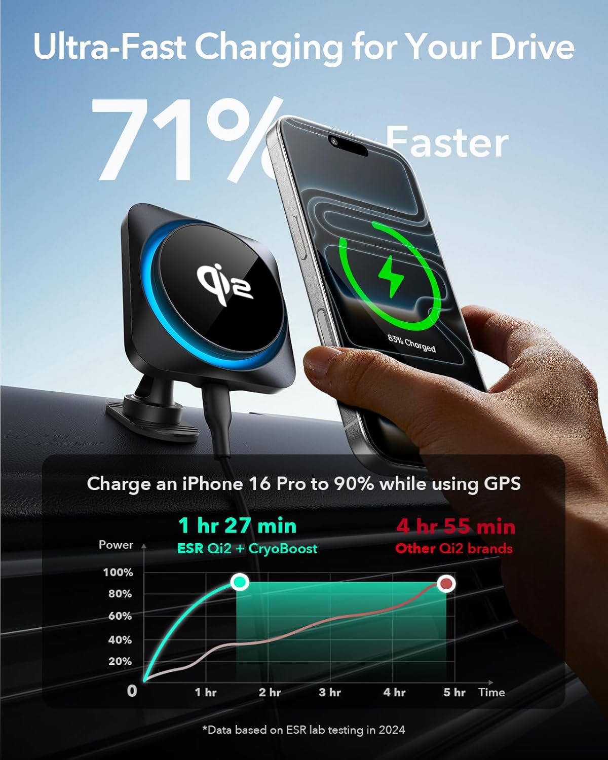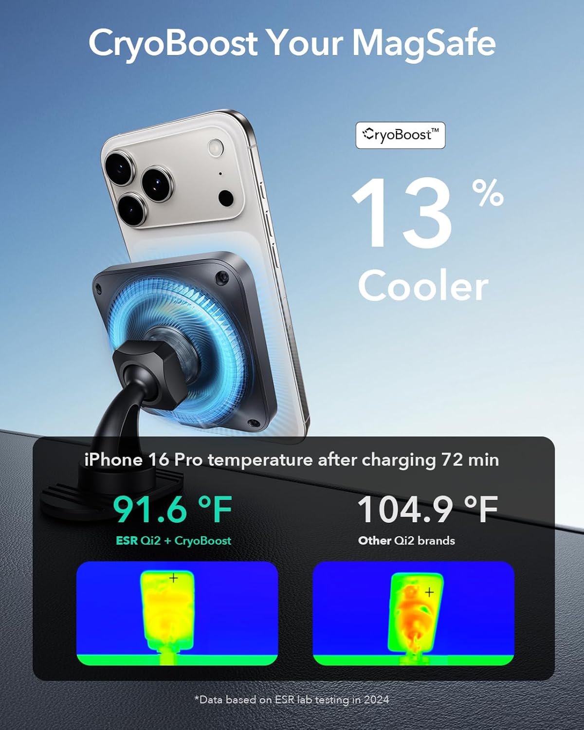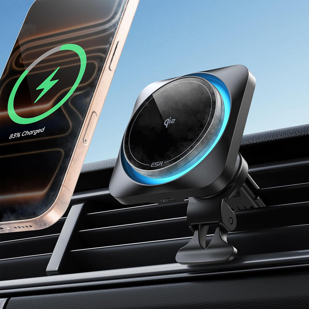Our ESR Qi2 15W MagSafe Car Mount Charger with CryoBoost delivers ultra-fast wireless charging with innovative cooling technology for consistent performance on the road. Designed with Qi2 certification for safe and efficient 15W power delivery, it supports iPhone 12–17 series, Galaxy S25, and Pixel 10 models with magnetic cases. The built-in CryoBoost cooling fan prevents overheating and maintains optimal charging speeds, while the strong magnetic lock ensures your device stays securely in place even on rough terrain. Offering both air vent and dashboard mounting options, this versatile charger keeps your phone accessible for navigation and calls during every drive.