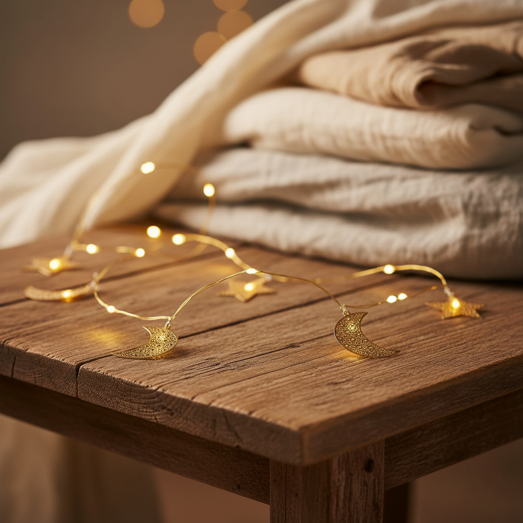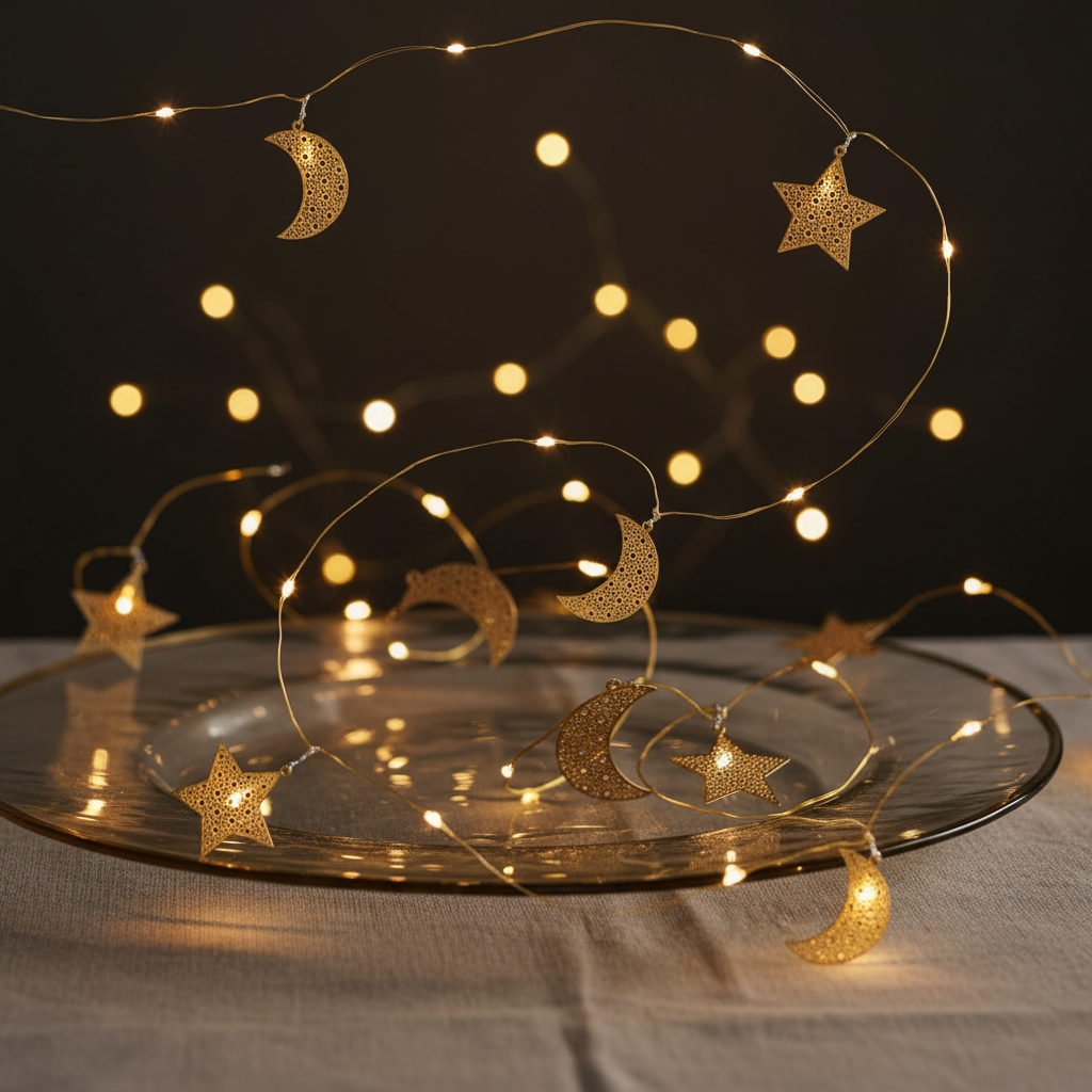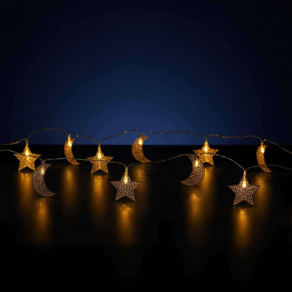 Enhance your Ramadan décor with this elegant filigree gold moon and star string light garland. Designed with delicate metal shapes and warm white micro LEDs, this decorative light creates a soft, calming glow that adds warmth and tradition to indoor spaces. Its refined design makes it ideal for hanging on walls, shelves, windows, or mantels during the holy month.