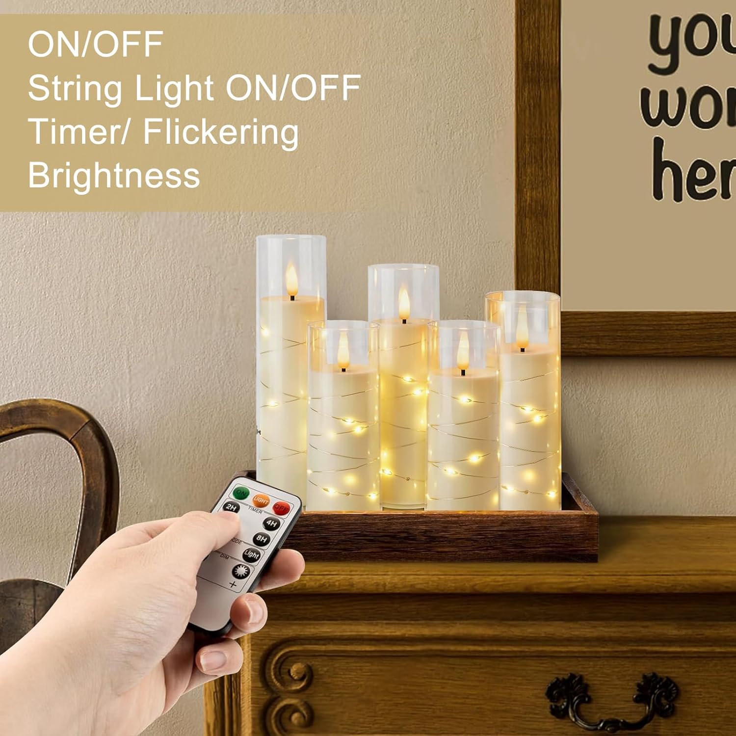 This elegant set of flameless LED candles features built-in fairy string lights and realistic flickering flames that recreate the warm glow of traditional candles—without fire, smoke, or dripping wax. Designed with a durable acrylic shell in a soft ivory tone, these candles deliver a romantic and cozy ambiance suitable for both everyday use and festive décor.