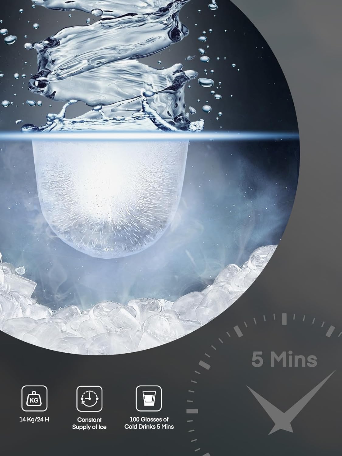 Produces up to 14 kg of fresh ice in 24 hours with 1.5L water tank