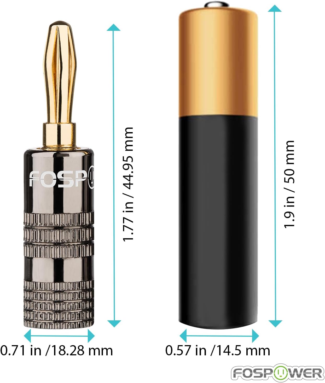 Our FosPower 5 Pairs 24K Gold Plated Banana Speaker Plugs offer a professional and reliable solution for connecting speaker wires to amplifiers, A/V receivers, and home theater systems. Designed for easy installation, these banana plugs feature a closed screw design that isolates wires and prevents shorting while securely holding the connections in place. The 6-leaf gold-plated connectors resist corrosion, and the color-coded collars allow quick identification of polarity. Compatible with 12AWG to 18AWG speaker wire, these plugs ensure a secure and high-quality audio connection for optimal performance.