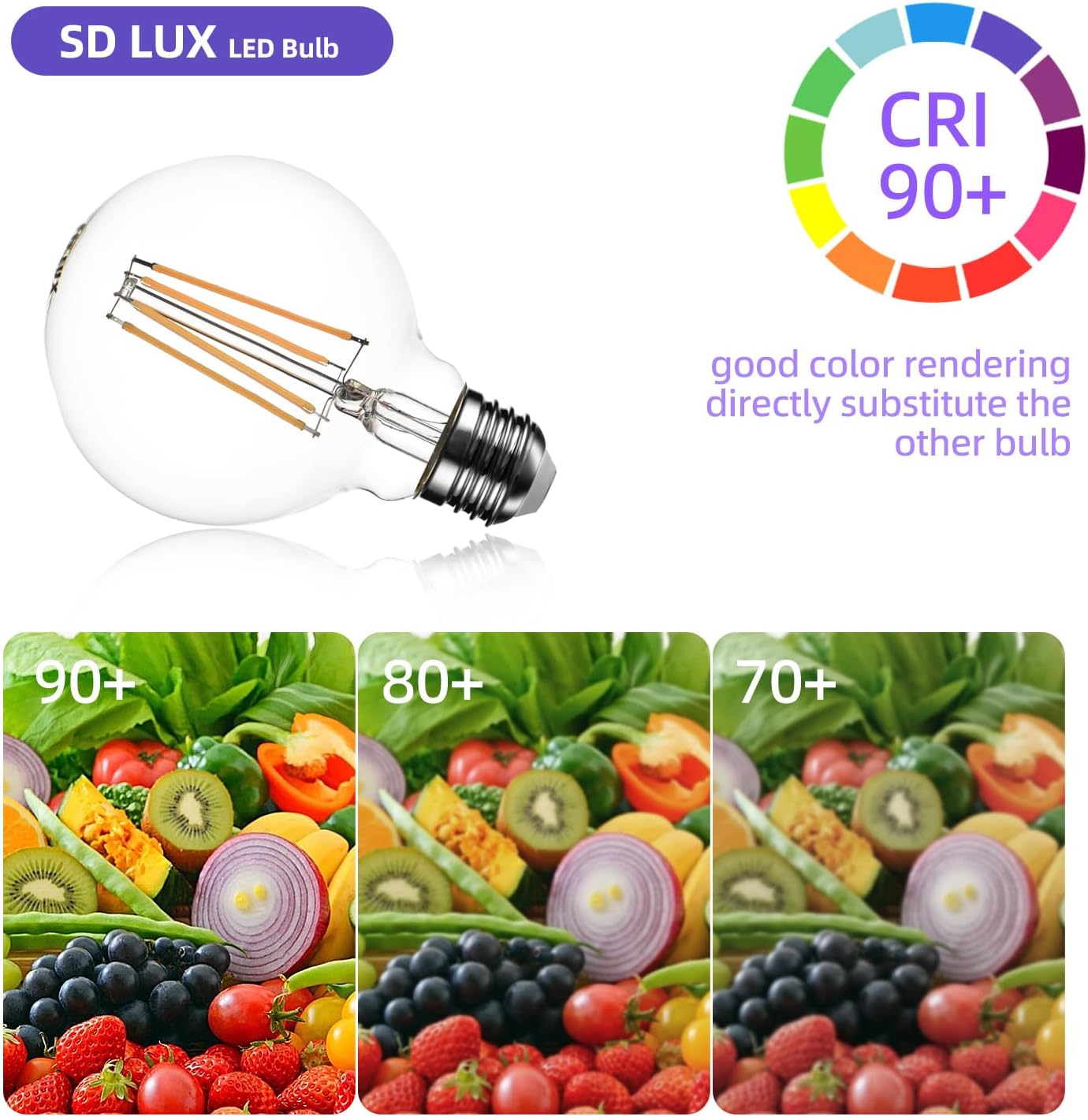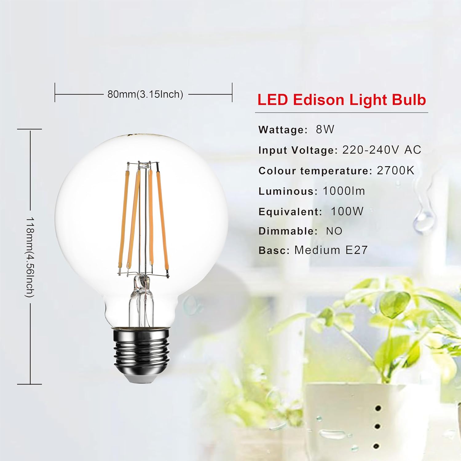 Our G80 E27 vintage globe decorative Edison LED bulbs, 8W power output, 1000 lumens brightness, 2700K warm white light, CRI >90, non-dimmable design, and clear glass finish deliver high-quality, energy-efficient illumination for decorative and functional lighting applications. Designed with a classic Edison-style globe shape and modern LED filament technology, these SD LUX bulbs provide accurate colour rendering and a warm, inviting ambience while offering long-lasting performance, reduced energy consumption, and compatibility with standard E27 fittings for use in homes, restaurants, and hospitality environments.