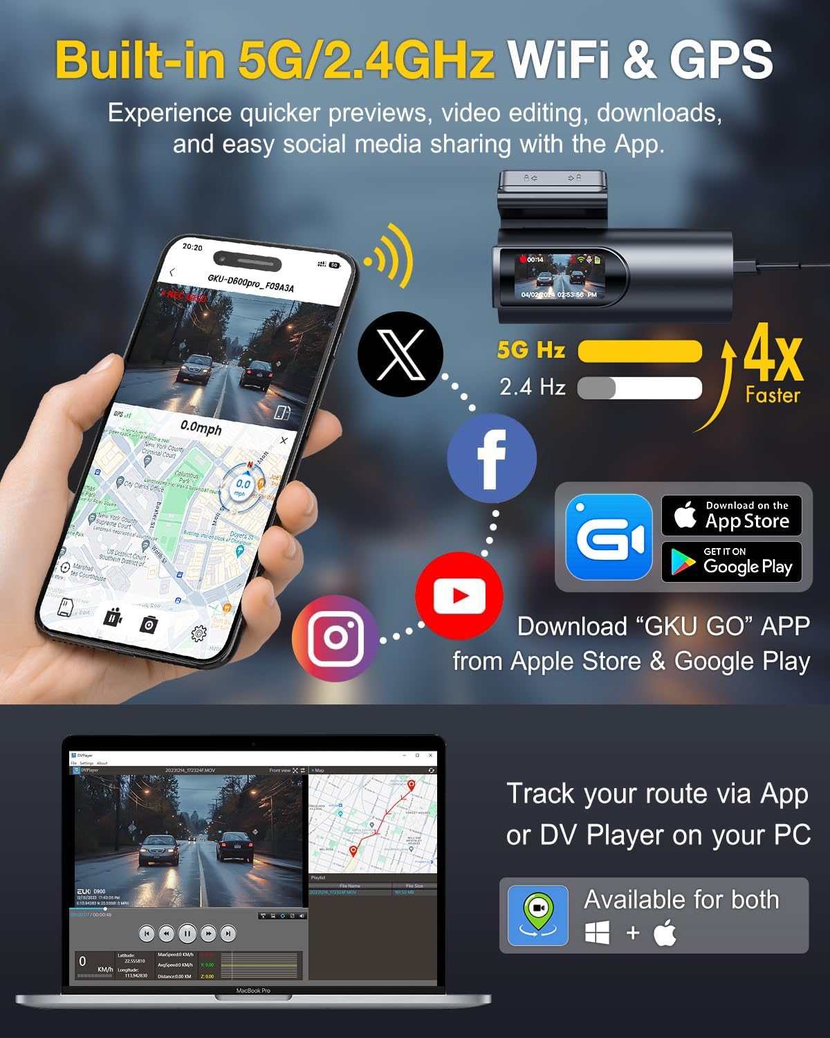 Capture every drive in stunning Ultra HD with the GKU D600Pro 4K+1080P Dual Dash Cam. Equipped with a front 4K 2160P camera and a rear 1080P camera, this dual dash cam ensures every angle of your journey is recorded in exceptional detail. Featuring a 170° wide-angle lens, large F1.8 aperture, and WDR night vision, it delivers crystal-clear footage even in low-light conditions.