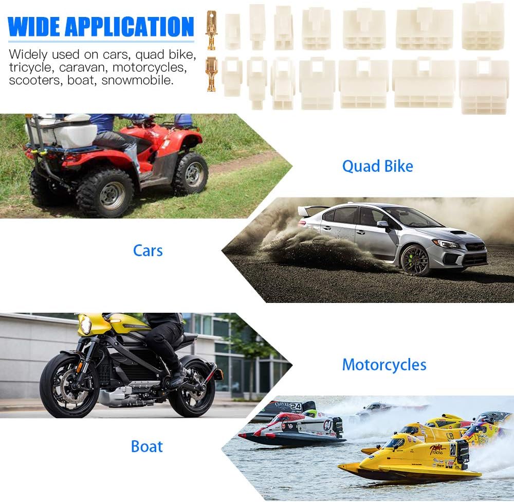 Our Glarks 400Pcs 6.3mm male and female wire connector kit is a versatile and high-quality solution for automotive and motorcycle wiring applications. This kit includes a variety of plug housings and terminals in multiple pin configurations, all made from durable heat-resistant insulation plastic and tin-plated copper for excellent conductivity, ensuring reliable electrical connections in cars, bikes, boats, and other vehicles.