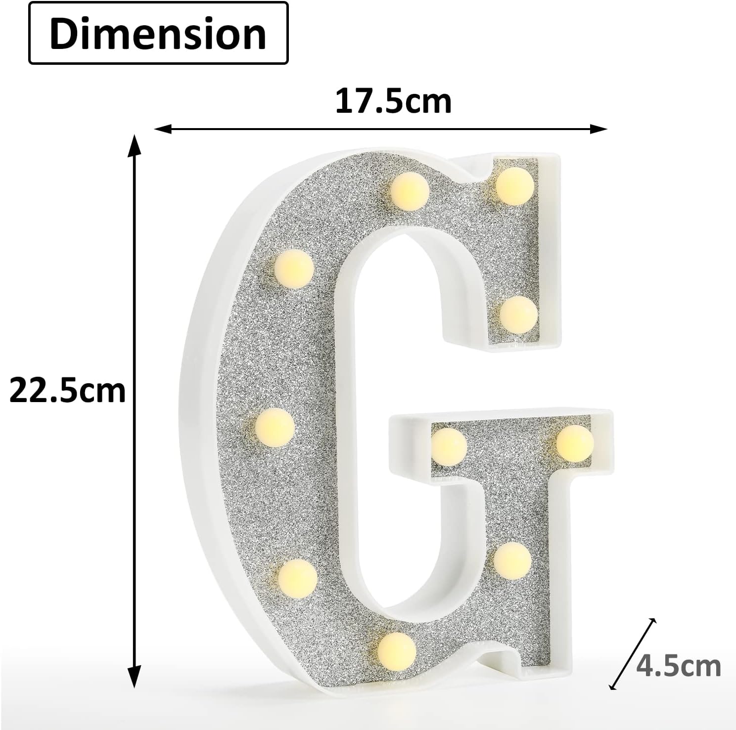 Glitter LED Letter Light G with 18 color changing options, sparkling silver glitter finish, remote control operation, and versatile wall or table display is designed to create eye-catching decorative lighting for bedrooms, parties, birthdays, weddings, and festive celebrations. Our decorative alphabet light features a shimmering glitter surface that produces a dazzling glow whether illuminated or switched off, while the RGB remote control allows convenient adjustment of colors, lighting modes, brightness, speed, and timer settings. With seven dynamic lighting effects and a stable flat-bottom design, the letter can stand securely on tables or be mounted easily on walls using the built-in keyhole slot. Ideal for displaying initials, names, or creative phrases, this stylish LED letter light adds vibrant ambience to home décor, special occasions, and seasonal decorations.