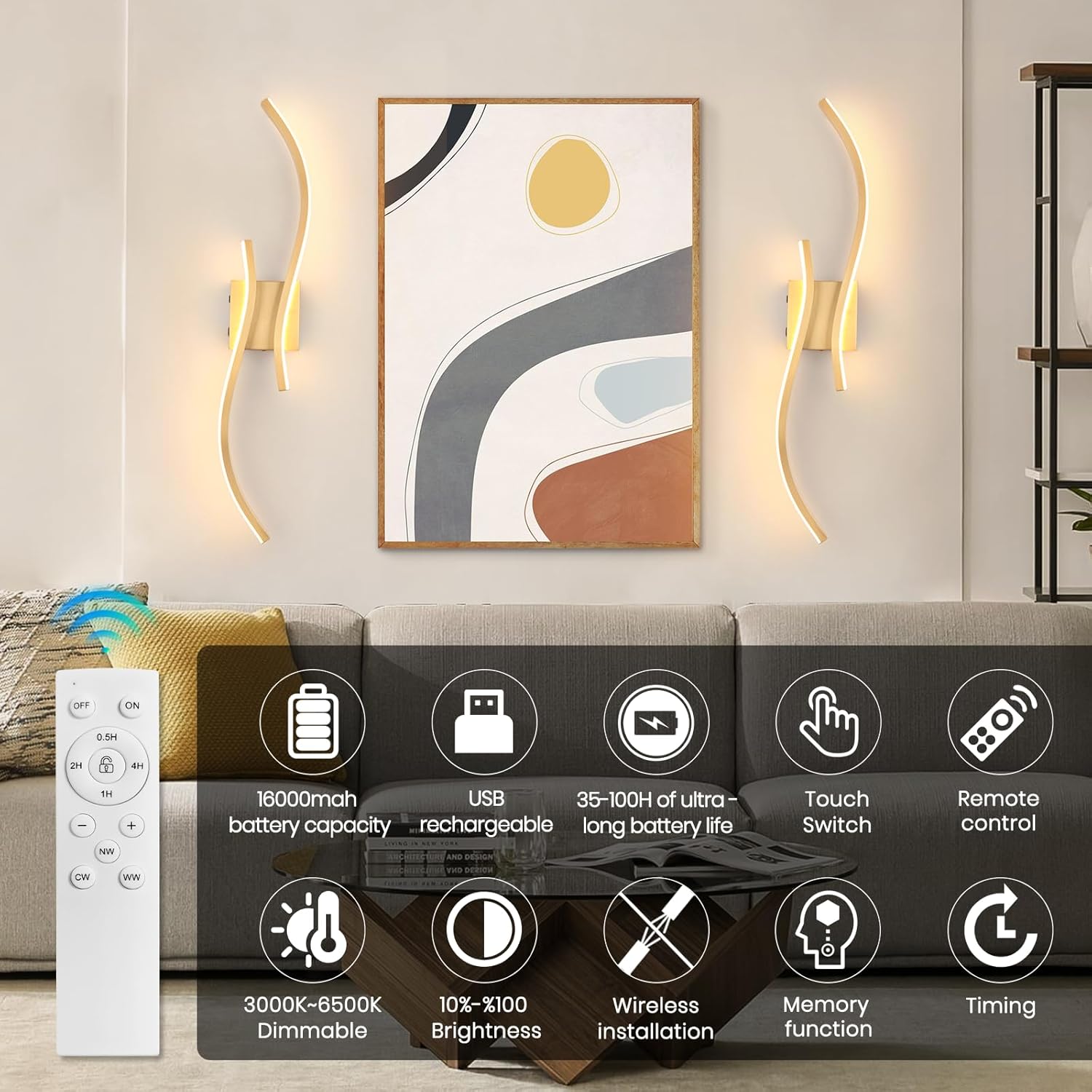 Our gold battery operated LED wall sconces set of 2 provides stylish and versatile wireless lighting for indoor spaces such as bedrooms, hallways, living rooms, or bedside areas. Featuring a matte gold metal finish and LED lights with adjustable color temperatures from 3000K to 6000K, these sconces deliver a warm to cool illumination to suit any mood or activity. Equipped with both remote and touch control, you can easily adjust brightness, set timers, or switch between colors without moving from your spot. The included 10000mAh rechargeable battery and USB Type-C charging cable ensure convenient and long-lasting use, making installation quick and hassle-free without wiring or electrician costs.